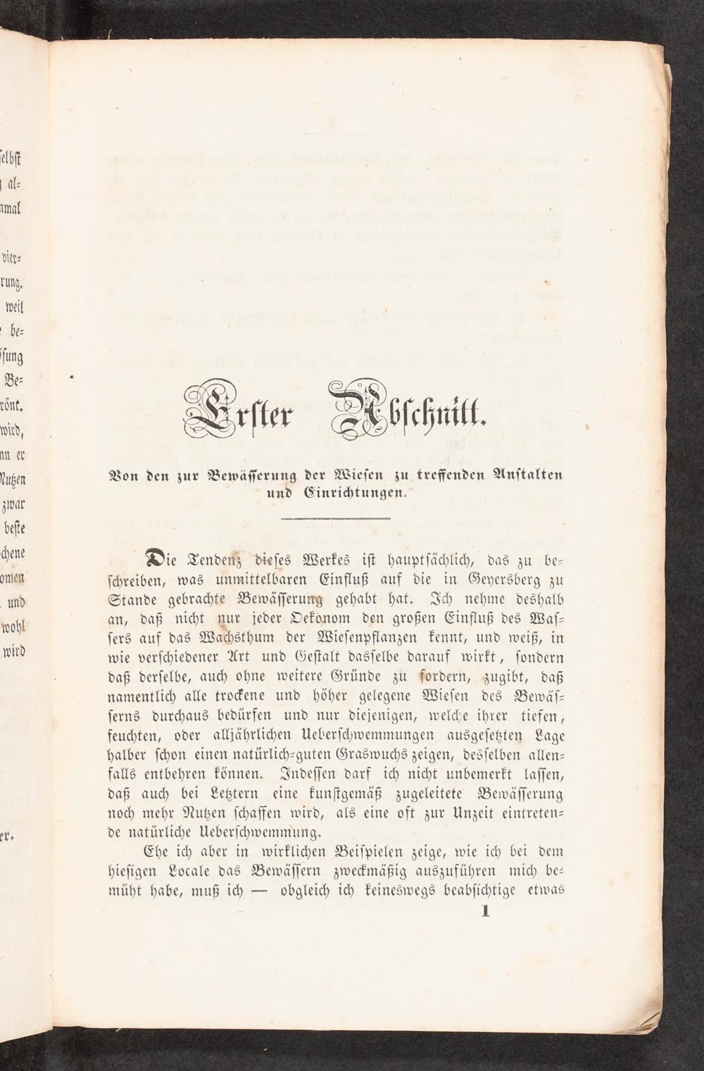 Die Tendenz dieſes Werkes iſt hauptſächlich, das zu be— ſchreiben, was unmittelbaren Einfluß auf die in Geyersberg zu Stande gebrachte Bewäſſerung gehabt hat. Ich nehme deshalb an, daß nicht nur jeder Oekonom den großen Einfluß des Waſ— ſers auf das Wachsthum der Wieſenpflanzen kennt, und weiß, in wie verſchiedener Art und Geſtalt dasſelbe darauf wirkt, ſondern daß derſelbe, auch ohne weitere Gründe zu fordern, zugibt, daß namentlich alle trockene und höher gelegene Wieſen des Bewäſ— ſerns durchaus bedürfen und nur diejenigen, welche ihrer tiefen, feuchten, oder alljährlichen Ueberſchwemmungen ausgeſetzten Lage halber ſchon einen natürlich-guten Graswuchs zeigen, desſelben allen— falls entbehren können. Indeſſen darf ich nicht unbemerkt laſſen, daß auch bei Letztern eine kunſtgemäß zugeleitete Bewäſſerung noch mehr Nutzen ſchaffen wird, als eine oft zur Unzeit eintreten— de natürliche Ueberſchwemmung.