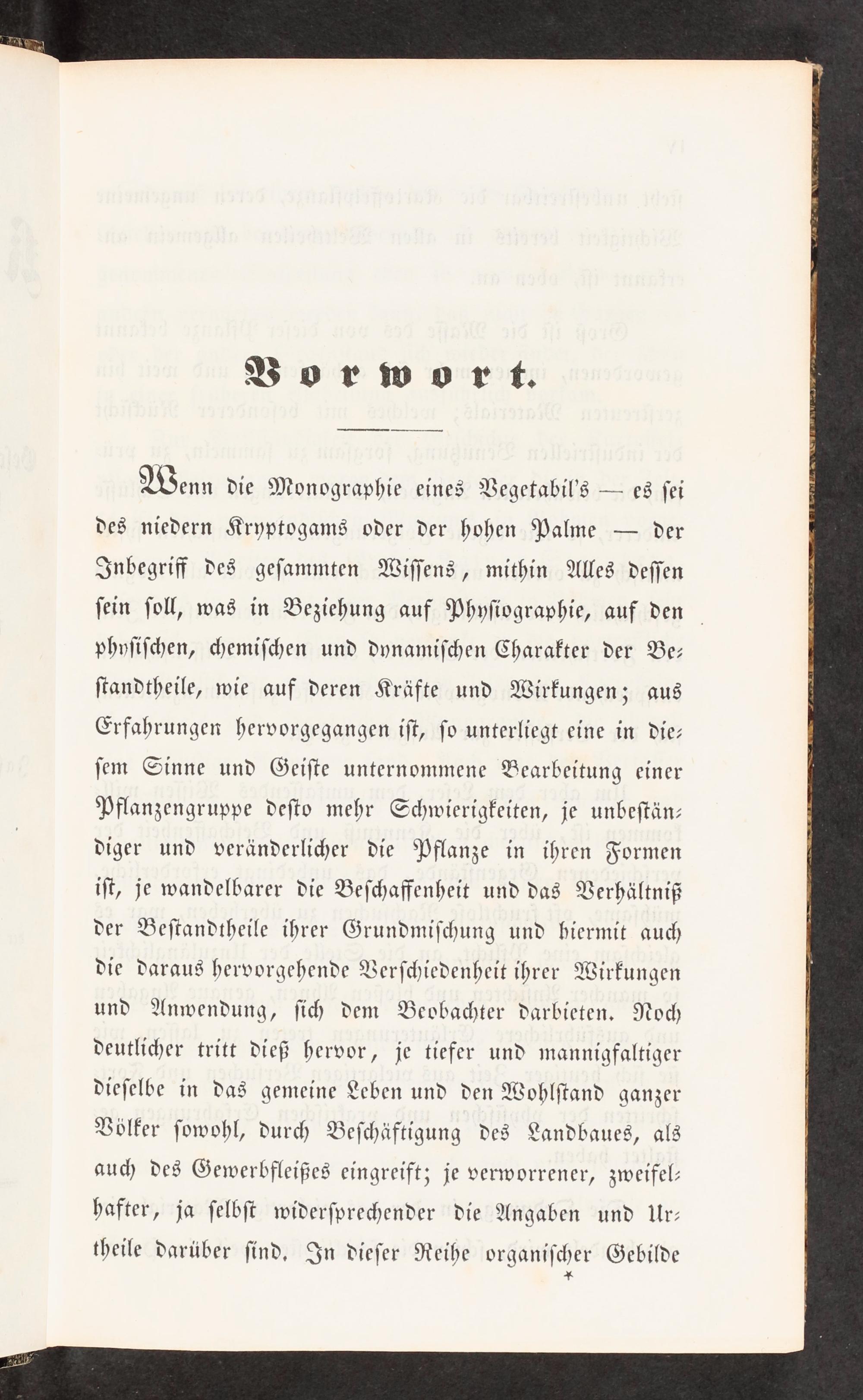 Wenn die Monographie eines Vegetabil's— es ſei des niedern Kryptogams oder der hohen Palme— der Inbegriff des geſammten Wiſſens, mithin Alles deſſen ſein ſoll, was in Beziehung auf Phyſiographie, auf den phyſiſchen, chemiſchen und dynamiſchen Charakter der Be— ſtandtheile, wie auf deren Kräfte und Wirkungen; aus Erfahrungen hervorgegangen iſt, ſo unterliegt eine in die— ſem Sinne und Geiſte unternommene Bearbeitung einer Pflanzengruppe deſto mehr Schwierigkeiten, je unbeſtän— diger und veränderlicher die Pflanze in ihren Formen iſt, je wandelbarer die Beſchaffenheit und das Verhältniß der Beſtandtheile ihrer Grundmiſchung und hiermit auch die daraus hervorgehende Verſchiedenheit ihrer Wirkungen und Anwendung, ſich dem Beobachter darbieten. Noch deutlicher tritt dieß hervor, je tiefer und mannigfaltiger dieſelbe in das gemeine Leben und den Wohlſtand ganzer Völker ſowohl, durch Beſchäftigung des Landbaues, als auch des Gewerbfleißes eingreift; je verworrener, zweifel— hafter, ja ſelbſt widerſprechender die Angaben und Ur—