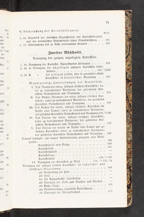 3n G. Unterſuchung des Ka rtoffelkrautes. ing. 3...—.... Seite Und 3§. 16. Uiberblick der ſinnlichen Eigenſchaften des Kartoffelkrautes, thei⸗ und der weſentlichen Beſtandtheile ſeiner Grundmiſchung 101 des§. 17. Unterſuchung des zu Aſche verbrannten Krautes..... 102 59) 54 der Zweiter Abſchnitt. Kn Benutzung der ganzen, unzerlegten Kartoffeln. .. 70 Kar⸗§. 18. Benutzung der Kartoffel⸗ Wurzelknollen überhaupt.... 103 77§. 19. A. Benutzung der unzeitigen(jungen) Kartoffeln insbe⸗ (un⸗ ſondere... e. e- 6, eIls d. 112,*) 549 §. 20. B.„ der zeitigen(reifen, oder ſo genannten alten) en Kartoffeln: in diätetiſcher Beziehung.. 117 und⸗ Mannigfaltige Zubereitungen der Kartoffeln. 79 1. Das Braten der rohen, ſaftigen(friſchen) Kartoffeln; da— bei zu beobachtendes Verfahren; der gebratenen Kar⸗ nen toffeln Beſchaffenheit und Benutzung....... 118 II. Das Röſten(Brennen) der rohen, ſaftigen(friſchen Kar— glich toffeln; dabei zu beobachtendes Verfahren; der geröſteten .. 8 Kartoffeln Beſchaffenheit und Benutzung...... 119 lte, III. Das Kochen der rohen, ſaftigen(friſchen) Kartoffeln im ett Waſſer oder Dampf; dabei zu beobachtendes Verfahren; der gekochten Kartoffeln Beſchaffenheit und Benutzung 120,*) 549 IV. Das Dörren der rohen, ſaftigen(friſchen) Kartoffeln; ner⸗ dabei zu beobachtendes Verfahren; der gedörrten Kar⸗ ſie toffeln Beſchaffenyeit und Benutzung....... 132 enn v. Das Dörren der vorher im Waſſer oder Dampf gar ge— nubt kochten Kartoffeln; dabei zu beobachtendes Verfahren; 85 der gedörrten Kartoffeln Beſchaffenheit und Benutzung. 141 89 Daraus erzeugte, zur langen Aufbewahrung geeignete rohe Mehl— ar⸗ ſpeiſen............. aBatn...en en 144 Kartoffelgries oder Grütze.......... 146 4, Kartoſfelreißsß.... 148 den Kartoffefnudeln......... ins Kartoffelſago„.... 7 1 Kartoffelmehl......... 149,*) 549 ürn VI. Benutzung der Kartoffeln zu Brod... 151,*) 552, 54 1 14 Benutzung der zeitigen(reifen) Kartoffeln: in techniſcher und der ſonſtiger Beziehung........ 166 5 zur Verſtärkung der Hefe......ne Itsn ⸗— ge⸗ als Hefe...... 1e 1te den.— bei der Pappendeckel⸗Fabrikation— 98 als Surrogat der Seife zum Waſchen und Bleichen.— 7 als Paſta(Teig)..... e... 169 1 100 zur Seifenbereitung(eigentlich Verfälſchung).— als Surrogat des Weizenkleiſters........ 170