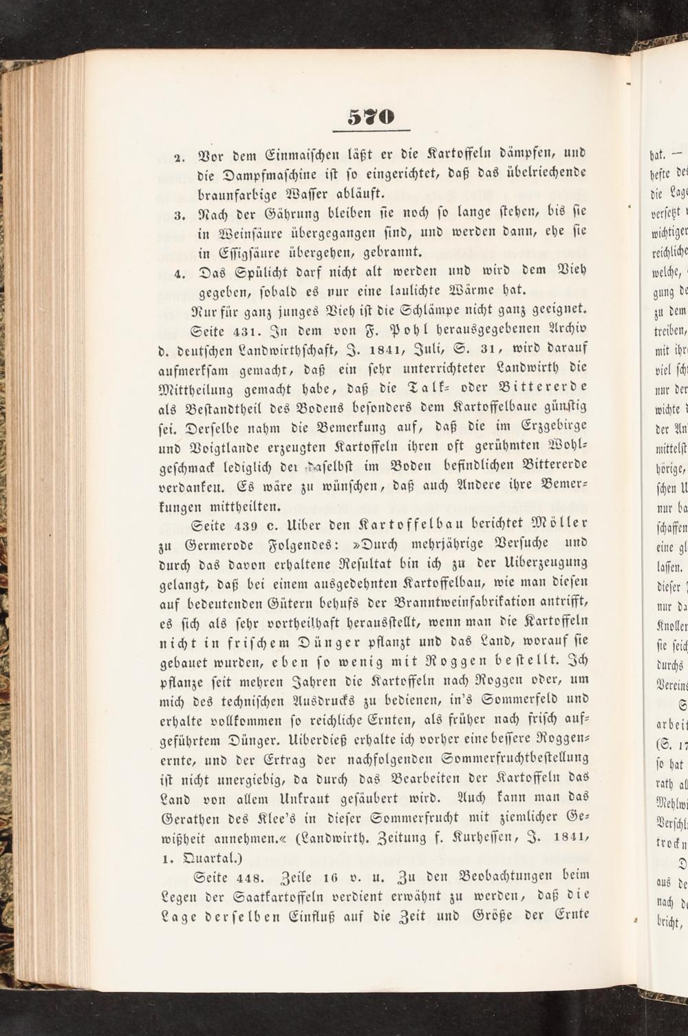 Seite 431. In dem von F. Pohl herausgegebenen Archiv d. deutſchen Landwirthſchaft, J. 1841, Juli, S. 31, wird darauf aufmerkſam gemacht, daß ein ſehr unterrichteter Landwirth die Mittheilung gemacht habe, daß die Talk⸗ oder Bittererde als Beſtandtheil des Bodens beſonders dem Kartoffelbaue günſtig ſei. Derſelbe nahm die Bemerkung auf, daß die im Erzgebirge und Voigtlande erzeugten Kartoffeln ihren oft gerühmten Wohl⸗ geſchmack lediglich der daſelbſt im Boden befindlichen Bittererde verdanken. Es wäre zu wünſchen, daß auch Andere ihre Bemer⸗ kungen mittheilten.