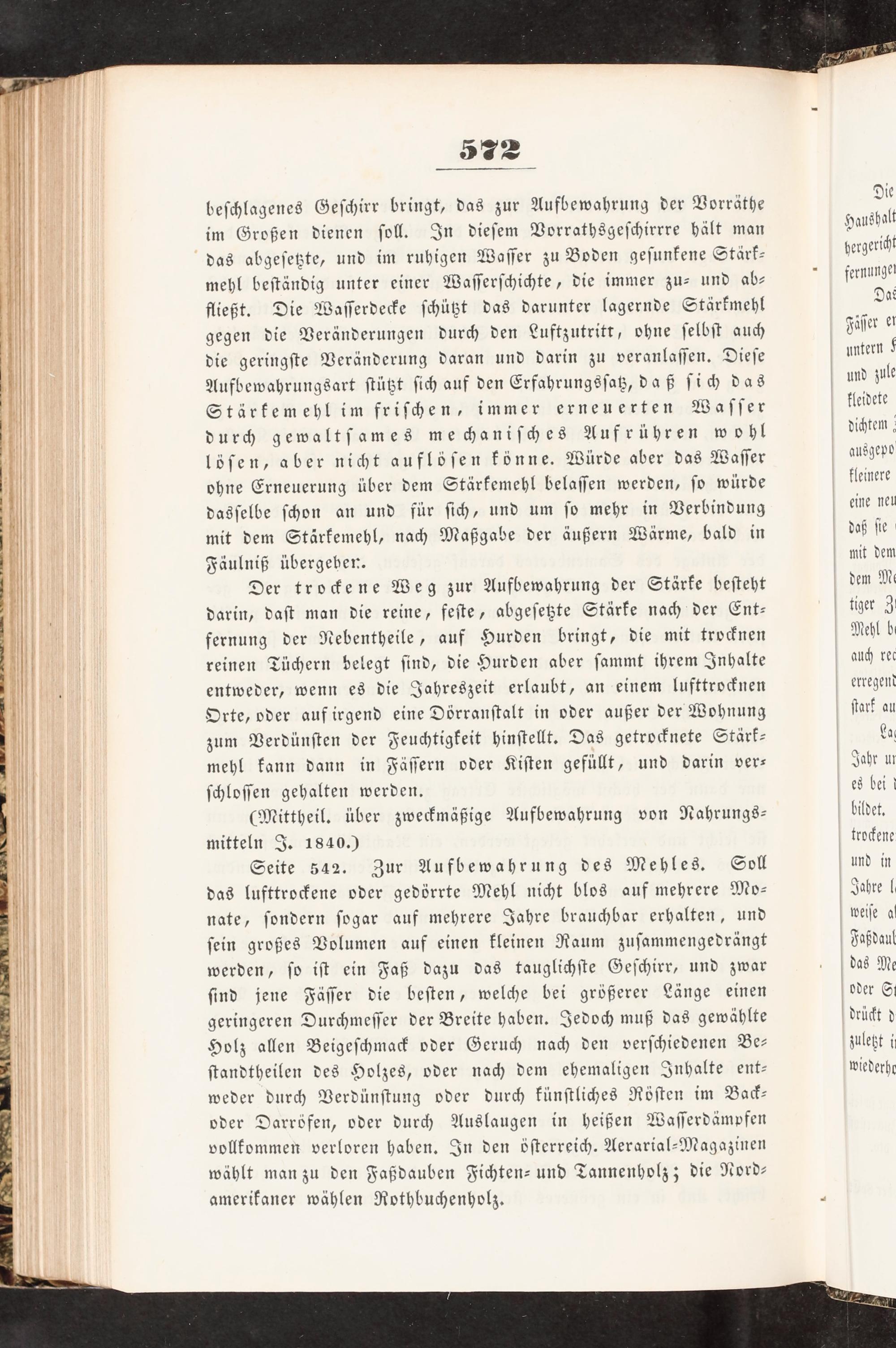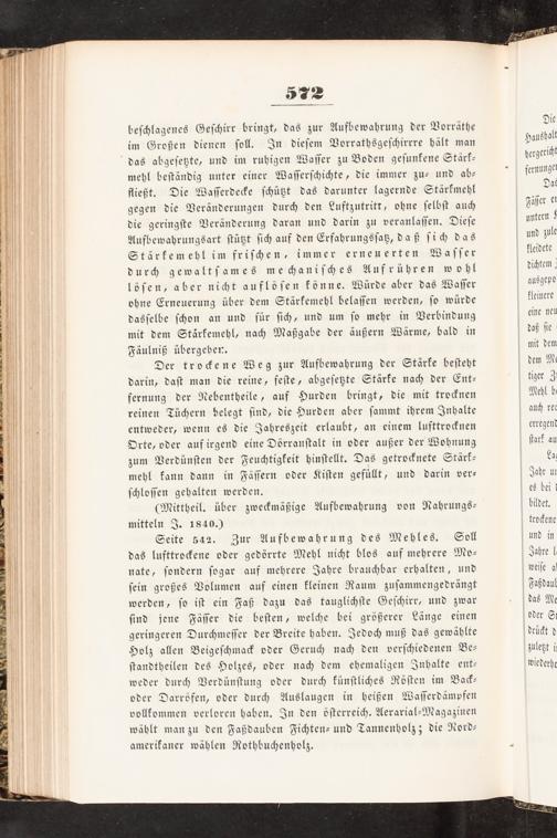 Seite 542. Zur Aufbewahrung des Mehles. Soll das lufttrockene oder gedörrte Mehl nicht blos auf mehrere Mo⸗ nate, ſondern ſogar auf mehrere Jahre brauchbar erhalten, und ſein großes Volumen auf einen kleinen Raum zuſammengedrängt werden, ſo iſt ein Faß dazu das tauglichſte Geſchirr, und zwar ſind jene Fäſſer die beſten, welche bei größerer Länge einen geringeren Durchmeſſer der Breite haben. Jedoch muß das gewählte Holz allen Beigeſchmack oder Geruch nach den verſchiedenen Be⸗ ſtandtheilen des Holzes, oder nach dem ehemaligen Inhalte ent⸗ weder durch Verdünſtung oder durch künſtliches Röſten im Back— oder Darröfen, oder durch Auslaugen in heißen Waſſerdämpfen vollkommen verloren haben. In den öſterreich. Aerarial-Magazinen wählt man zu den Faßdauben Fichten- und Tannenholz; die Nord— amerikaner wählen Rothbuchenholz.