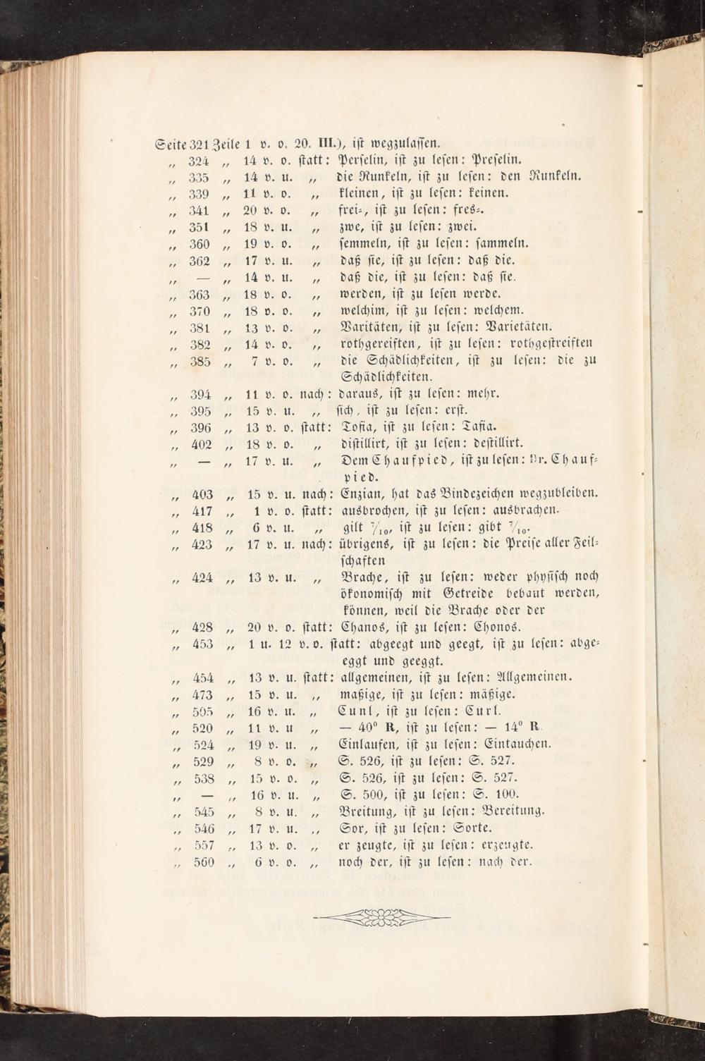 14 v. o. ſtatt: Perſelin, iſt zu leſen: Preſelin. 14 v. u.„ die Runkeln, iſt zu leſen: den Runkeln. 11 v. o.„ kleinen, iſt zu leſen: keinen. 20 v. oöo.„ frei⸗, iſt zu leſen: fres⸗. 18 v. u.„ zweo, iſt zu leſen: zwei. 19 v. o.„ ſemmeln, iſt zu leſen: ſammeln. 17 v. u.„ daß ſie, iſt zu leſen: daß die. 14 v. u.„ daß die, iſt zu leſen: daß ſie. 18 v. o.„ werden, iſt zu leſen werde. 18 v. o.„ welchim, iſt zu leſen: welchem. 13 v. o.„ Vaaritäten, iſt zu leſen: Varietäten. 14 v. o.„ rwothgereiften, iſt zu leſen: rothgeſtreiften 7 v. o.„ die Schädlichkeiten, iſt zu leſen: die zu Schädlichkeiten. 11 v. o. nach: daraus, iſt zu leſen: mehr. 15 v. u.„Nſich, iſt zu leſen: erſt. 13 v. o. ſtatt: Tofia, iſt zu leſen: Tafia. 18 v. o.„ diſtilirt, iſt zu leſen: deſtillirt. 17 v. u.„ Dem Chaufpied, iſt zu leſen: Hr. Chauf⸗ pied. 15 v. u. nach: Enzian, hat das Bindezeichen wegzubleiben. 1 v. o. ſtatt: ausbrochen, iſt zu leſen: ausbrachen. 6 v. u.„ gilt„o, iſt zu leſen: gibt ⸗ 17 v. u. nach: übrigens, iſt zu leſen: die Preiſe aller Feil— ſchaften 13 v. u.„ Brache, iſt zu leſen: weder phyſiſch noch ökonomiſch mit Getreide bebaut werden, können, weil die Brache oder der 20 v. o. ſtatt: Chanos, iſt zu leſen: Chonos. 1 u. 12 v. o. ſtatt: abgeegt und geegt, iſt zu leſen: abge⸗ eggt und geeggt. 13 v. u. ſtatt: allgemeinen, iſt zu leſen: Allgemeinen. 15 v. u.„ maßige, iſt zu leſen: mäßige. 16 v. u.„ Cunl, iſt zu leſen: Curl. 11 v. u„— 40° R, iſt zu leſen:— 14° R 19 v. u.„ Einlaufen, iſt zu leſen: Eintauchen. 8 v. o.„ S. 526, iſt zu leſen: S. 527. 15 v. o.„ S. 526, iſt zu leſen: S. 527. 16 v. u.„ S. 500, iſt zu leſen: S. 100. 8 v. u.„ Breitung, iſt zu leſen: Bereitung. 17 v. u. Sor, iſt zu leſen: Sorte. 13 v. o.„ er zeugte, iſt zu leſen: erzeugte. 6 v. o.„ nooch der, iſt zu leſen: nach der.