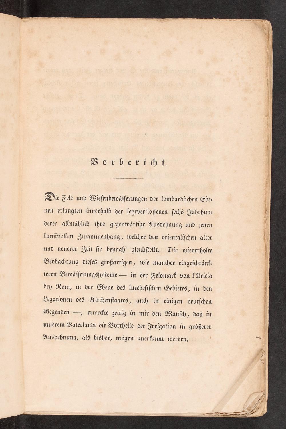 Die Feld und Wieſenbewaͤſſerungen der lombardiſchen Ebe— nen erlangten innerhalb der letztverfloſſenen ſechs Jahrhun⸗ derte allmaͤhlich ihre gegenwaͤrtige Ausdehnung und jenen kunſtvollen Zuſammenhang, welcher den orientaliſchen alter und neuerer Zeit ſie beynah' gleichſtellt. Die wiederholte Beobachtung dieſes großartigen, wie mancher eingeſchraͤnk— teren Bewaͤſſerungsſyſteme— in der Feldmark von l Aricia bey Rom, in der Ebene des luccheſiſchen Gebietes, in den Legationen des Kirchenſtaates, auch in einigen deutſchen Gegenden—, erweckte zeitig in mir den Wunſch, daß in unſerem Vaterlande die Vortheile der Irrigation in groͤßerer