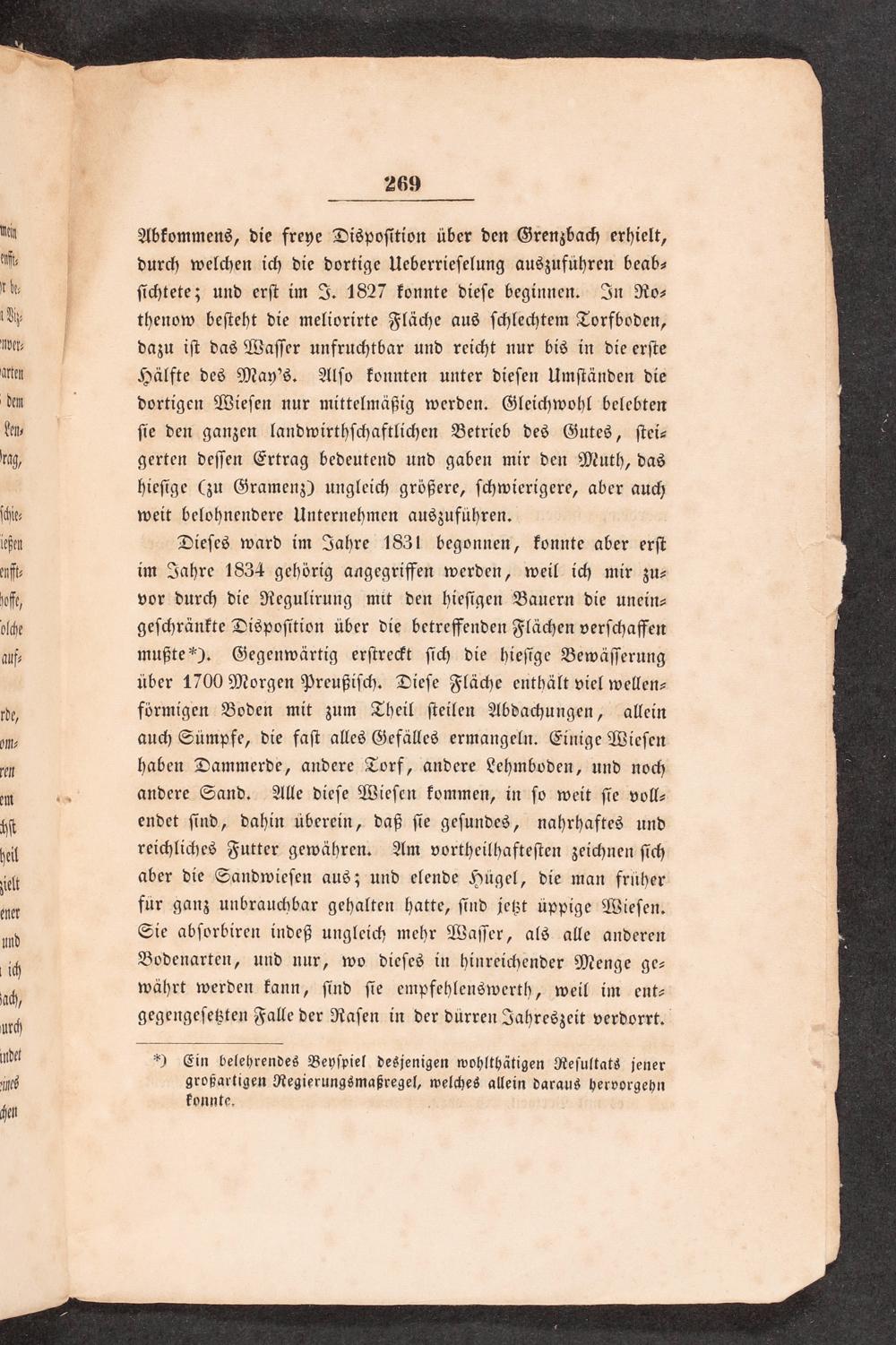Dieſes ward im Jahre 1831 begonnen, konnte aber erſt im Jahre 1834 gehörig angegriffen werden, weil ich mir zu⸗ vor durch die Regulirung mit den hieſigen Bauern die unein⸗ geſchränkte Dispoſition über die betreffenden Flächen verſchaffen mußte*). Gegenwärtig erſtreckt ſich die hieſige Bewäſſerung über 1700 Morgen Preußiſch. Dieſe Fläche enthält viel wellen— förmigen Boden mit zum Theil ſteilen Abdachungen, allein auch Sümpfe, die faſt alles Gefälles ermangeln. Einige Wieſen haben Dammerde, andere Torf, andere Lehmboden, und noch andere Sand. Alle dieſe Wieſen kommen, in ſo weit ſie voll— endet ſind, dahin überein, daß ſie geſundes, nahrhaftes und reichliches Futter gewähren. Am vortheilhafteſten zeichnen ſich aber die Sandwieſen aus; und elende Hügel, die man früher fuͤr ganz unbrauchbar gehalten hatte, ſind jetzt üppige Wieſen. Sie abſorbiren indeß ungleich mehr Waſſer, als alle anderen Bodenarten, und nur, wo dieſes in hinreichender Menge ge— währt werden kann, ſind ſie empfehlenswerth, weil im ent— gegengeſetzten Falle der Raſen in der dürren Jahreszeit verdorrt.