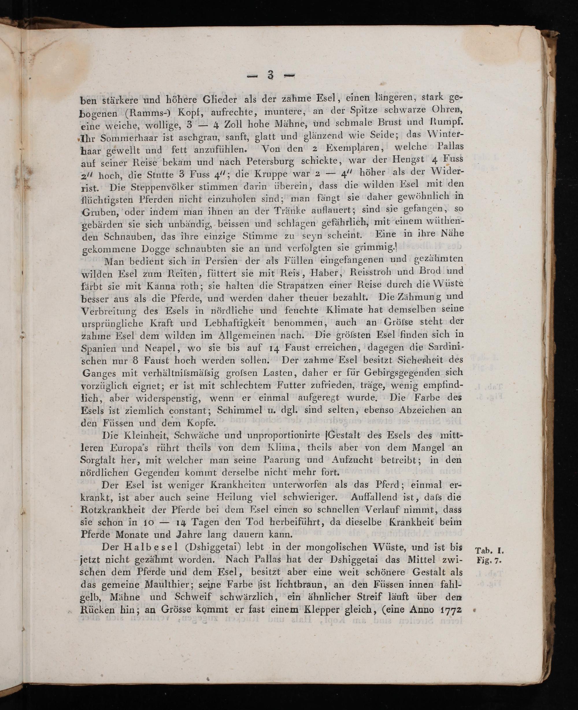 Der Halbesel(Dshiggetai) lebt in der mongolischen Wüste, und ist bis jetzt nicht gezähmt worden. Nach Pallas hat der Dshiggetai das Mittel zwi- schen dem Pferde und dem Esel, besitzt aber eine weit schönere Gestalt als das gemeine Maulthier; seine Farbe ſist lichtbraun, an den Füssen innen fahl- gelb, Mähne und Schweif schwärzlich, ein ähnlicher Streif läuft über den Rücken hin; an Grösse kommt er fast einem Klepper gleich,(eine Anno 1772