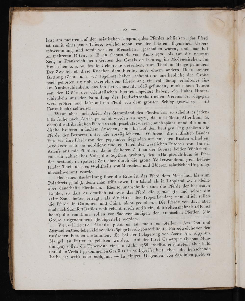 lälst am meisten auf den asiatischen Ursprung des Pferdes schlieſsen; das Pferd ist somit eines jener Thiere, welche schon vor der letzten allgemeinen Ueber- schwemmung, und somit vor dem Menschen, geschaffen waren, und man hat an mehreren Orten, z. B. in Cannstadt von Anno 1700 bis auf die neueste Zeit, in Frankreich beim Graben des Canals de Ouroq, im Modenesischen, im Hessischen u. s. w. fossile Ueberreste desselben, zum Theil in Menge gefunden. Der Zweifel, ob diese Knochen dem Pferde, oder einem andern Thiere seiner Gattung(Zebra u. s. W.) angebört haben, scheint mir unerheblich; der Grölſse nach gehörten sie unbezweifelt dem Pferde an; ein vollständig erhaltenes lin- kes Vorderschienbein, das ich bei Cannstadt 1823 gefunden, muſs einem Thiere von der Grölſse des orientalischen Pferdes angehört haben, ein linkes Hinter- schienbein aus der Sammlung des landwirthschaftlichen Vereins ist dagegen weit grölser und lälst auf ein Pferd von dem grölsten Schlag(etwa 17— 18 Faust hoch) schlieſsen.