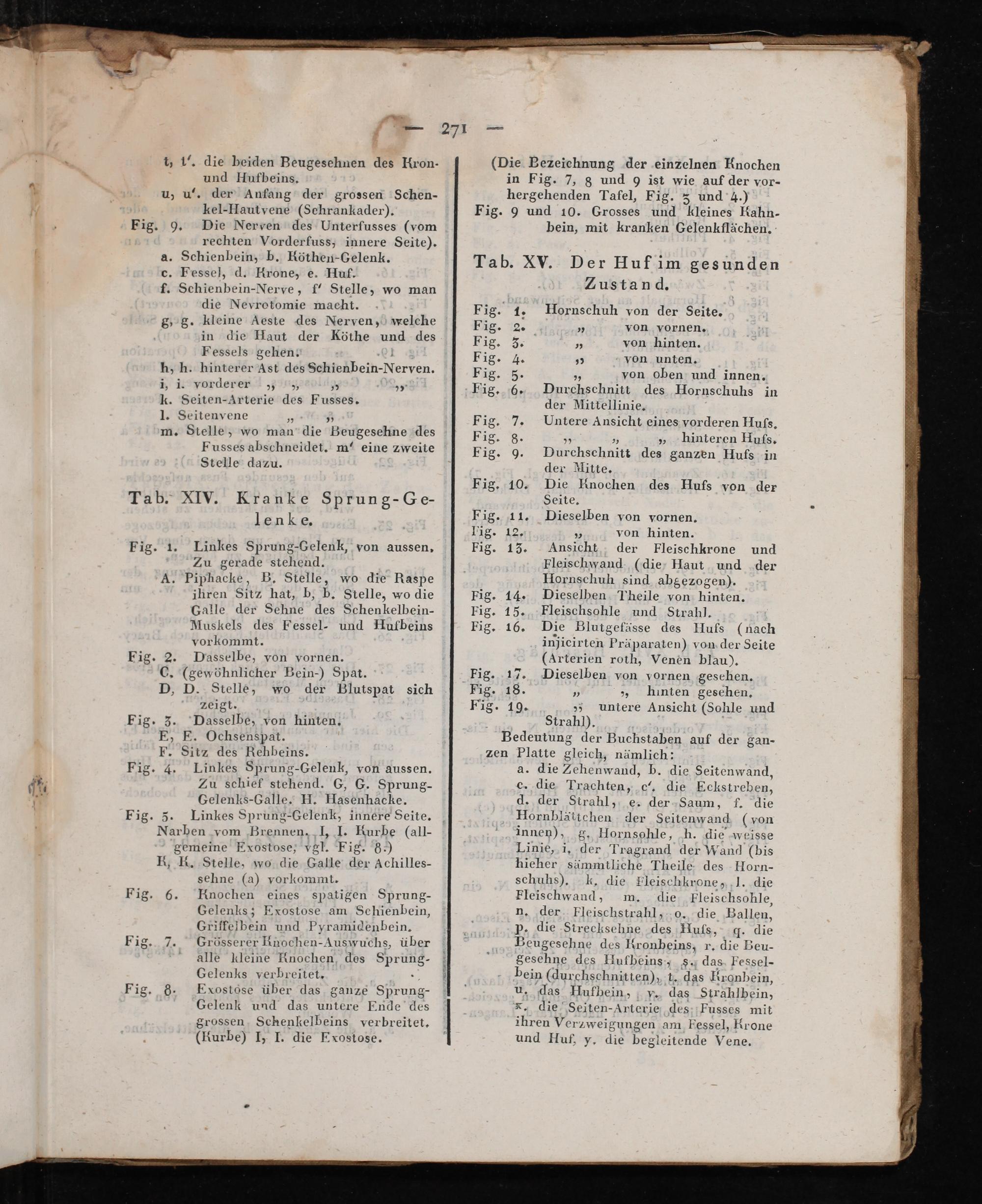 a. die Zehenwand, P. die Seitenwand, c. die Trachten, c“. die Eekstreben, d. der Strahl, e. der Saum, f. die Hornblättchen der Seitenwand(von innen), g. Hornsohle, h. die weisse Linie, i, der Tragrand der Wand(bis hieher sämmtliche Theile des Horn- schuhs). k, die Fleischkrone, J. die Fleischwand, m. die Fleischsohle, n. der Pleischstrahl, o. die Ballen, p. die Strecksehne des Hufs, q. die Beugesehne des Meashehnen r. die Beu- geschne des Hufbeins, s. das Pessel- bein(durchschnitten), t. 11 Rronbein, u., das Hufbein, v. das Strahlbein, x. die Seiten-Arterie des Fusses mit ihren Verzweigungen am Fessel, Krone und Huf, y. die begleitende Vene.