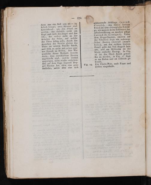 schliessende Schlinge(noeud- d'arrét). Am linken hintern Fessel ist eine chirurgische Schlin- ge, wie man sie beim Schliessen der Aderlassöffnung zu machen pflegt (noeud de la saigné). Ueber dem Doppelknoten,(mitten auf der Schulter) liegt ein unbeweg- licher Knoten(noeud immo- bile), um den rechten hintern Fessel geht das Seil doppelt her- um, und am Widerriss ist der letzte einfache Knotep. In Fig. 16 ist das Pferd bereit gewor- fen zu werden, in Fig. 17 liegt es am Boden und ist vollends ge- fesselt.
