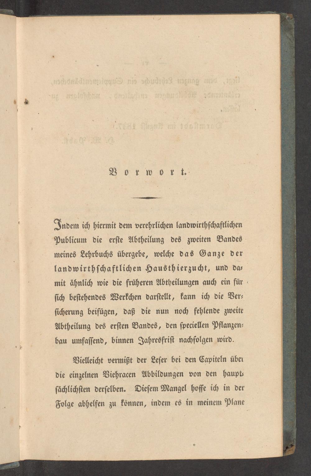 Indem ich hiermit dem verehrlichen landwirthſchaftlichen Publicum die erſte Abtheilung des zweiten Bandes meines Lehrbuchs übergebe, welche das Ganze der landwirthſchaftlichen Hausthierzucht, und da⸗ mit ähnlich wie die früheren Abtheilungen auch ein für ſich beſtehendes Werkchen darſtellt, kann ich die Ver⸗ ſicherung beifügen, daß die nun noch fehlende zweite Abtheilung des erſten Bandes, den ſpeciellen Pflanzen⸗ bau umfaſſend, binnen Jahresfriſt nachfolgen wird.