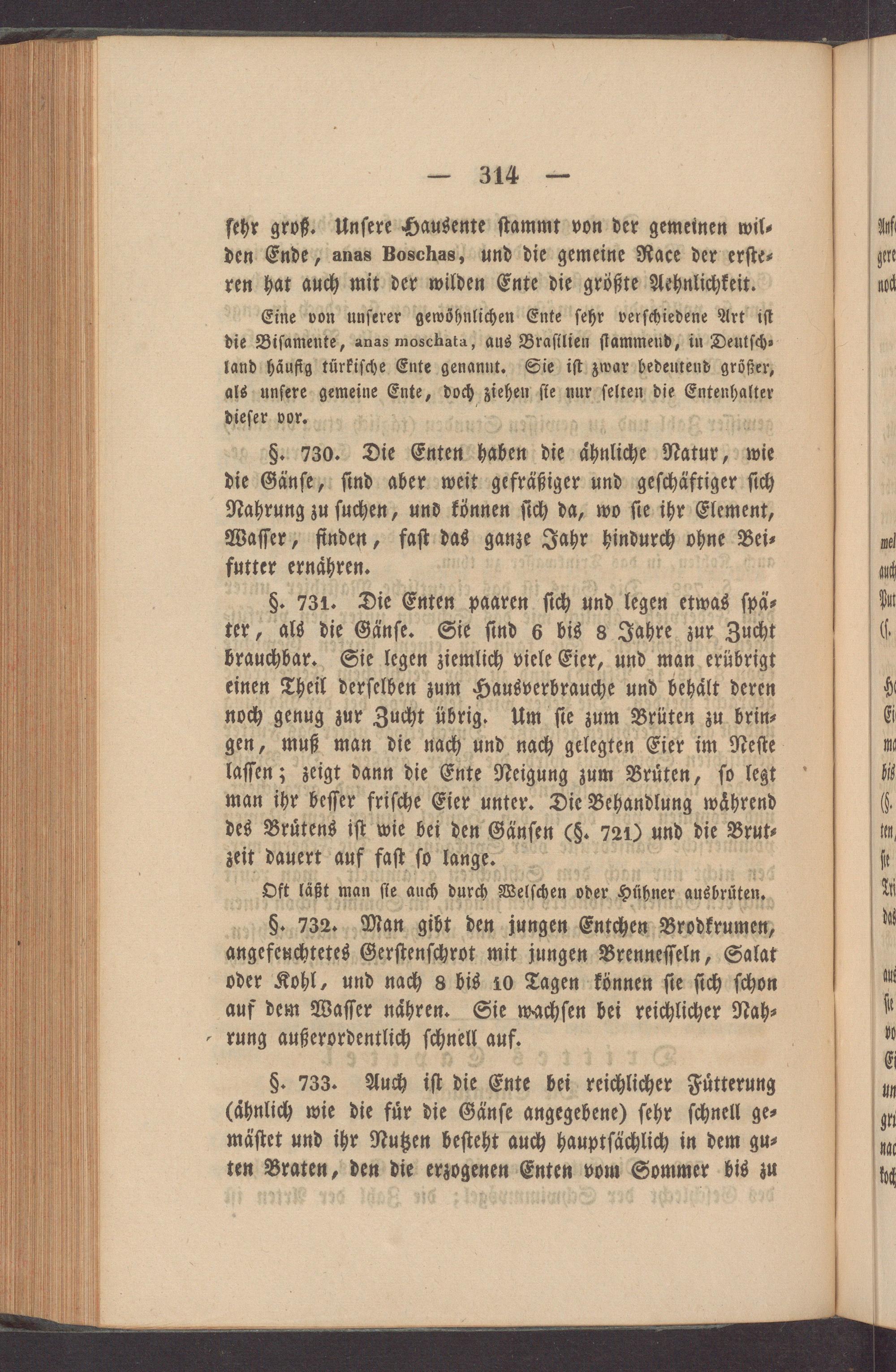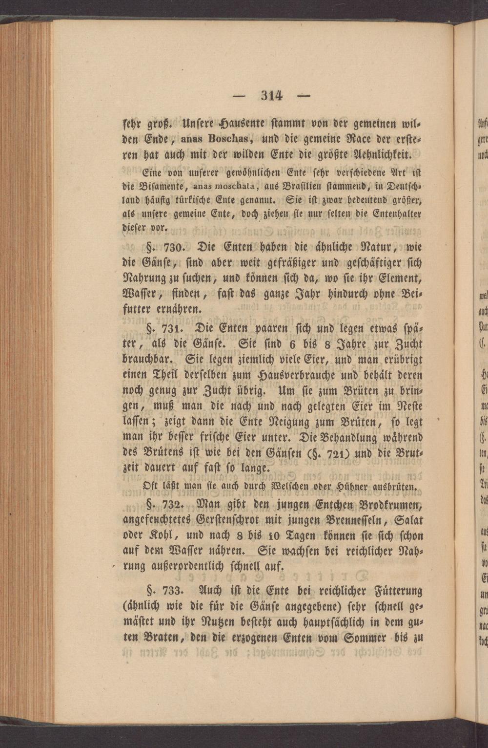 §. 730. Die Enten haben die ähnliche Natur, wfe die Gänſe, ſind aber weit gefräßiger und geſchäftiger ſich Nahrung zu ſuchen, und können ſich da, wo ſie ihr Element, Waſſer, finden, faſt das Sandt Jahr hindurch ohne Bei⸗ futter ernaͤhren.