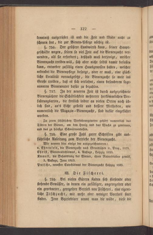 §. 757. In der neueren Zeit iſt durch ausgezeichnete Bienenzuͤchter die Schädlichkeit mehrerer herkoͤmmlichen Ver⸗ fahrungsarten, die freilich leider an vielen Orten noch üb⸗ lich ſind, an's Licht geſtellt und beſſere Methoden, wie namentlich die Magazin⸗Bienenzucht, ſind dafür eingeführt worden.