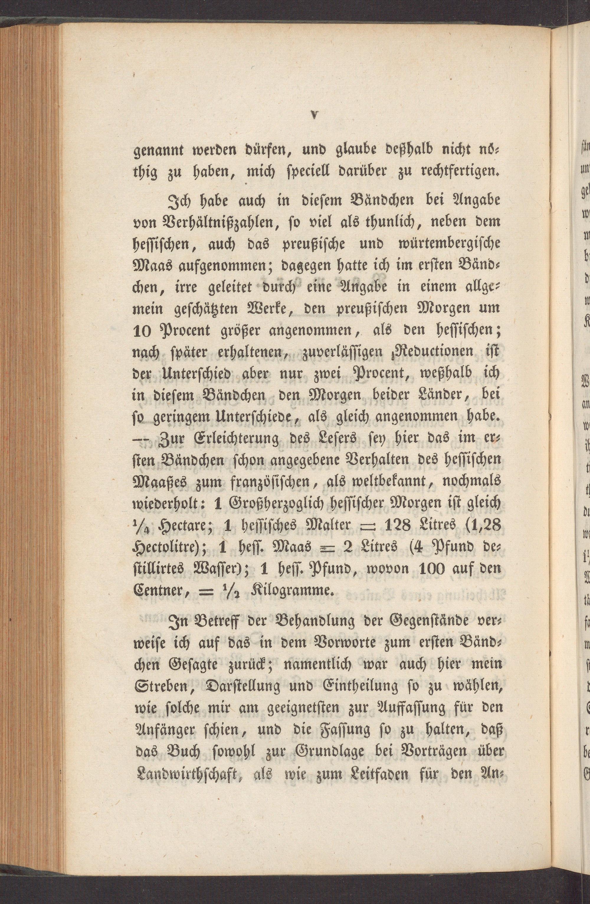 Ich habe auch in dieſem Bändchen bei Angabe von Verhältnißzahlen, ſo viel als thunlich, neben dem heſſiſchen, auch das preußiſche und würtembergiſche Maas aufgenommen; dagegen hatte ich im erſten Bänd⸗ chen, irre geleitet durch eine Angabe in einem allge⸗ mein geſchätzten Werke, den preußiſchen Morgen um 10 Procent größer angenommen, als den heſſiſchen; nach ſpäter erhaltenen, zuverläſſigen Reductionen iſt der Unterſchied aber nur zwei Procent, weßhalb ich in dieſem Bändchen den Morgen beider Länder, bei ſo geringem Unterſchiede, als gleich angenommen habe. — Zur Erleichterung des Leſers ſey hier das im er⸗ ſten Bändchen ſchon angegebene Verhalten des heſſiſchen Maaßes zum franzöſiſchen, als weltbekannt, nochmals wiederholt: 1 Großherzoglich heſſiſcher Morgen iſt gleich ½ Hectare; 1 heſſiſches Malter= 128 Litres(1,28 Hectolitre); 1 heſſ. Maas= 2 Litres(4 Pfund de⸗ ſtillirtes Waſſer); 1 heſſ. Pfund, wovon 100 auf den Centner,= ½ Kilogramme.
