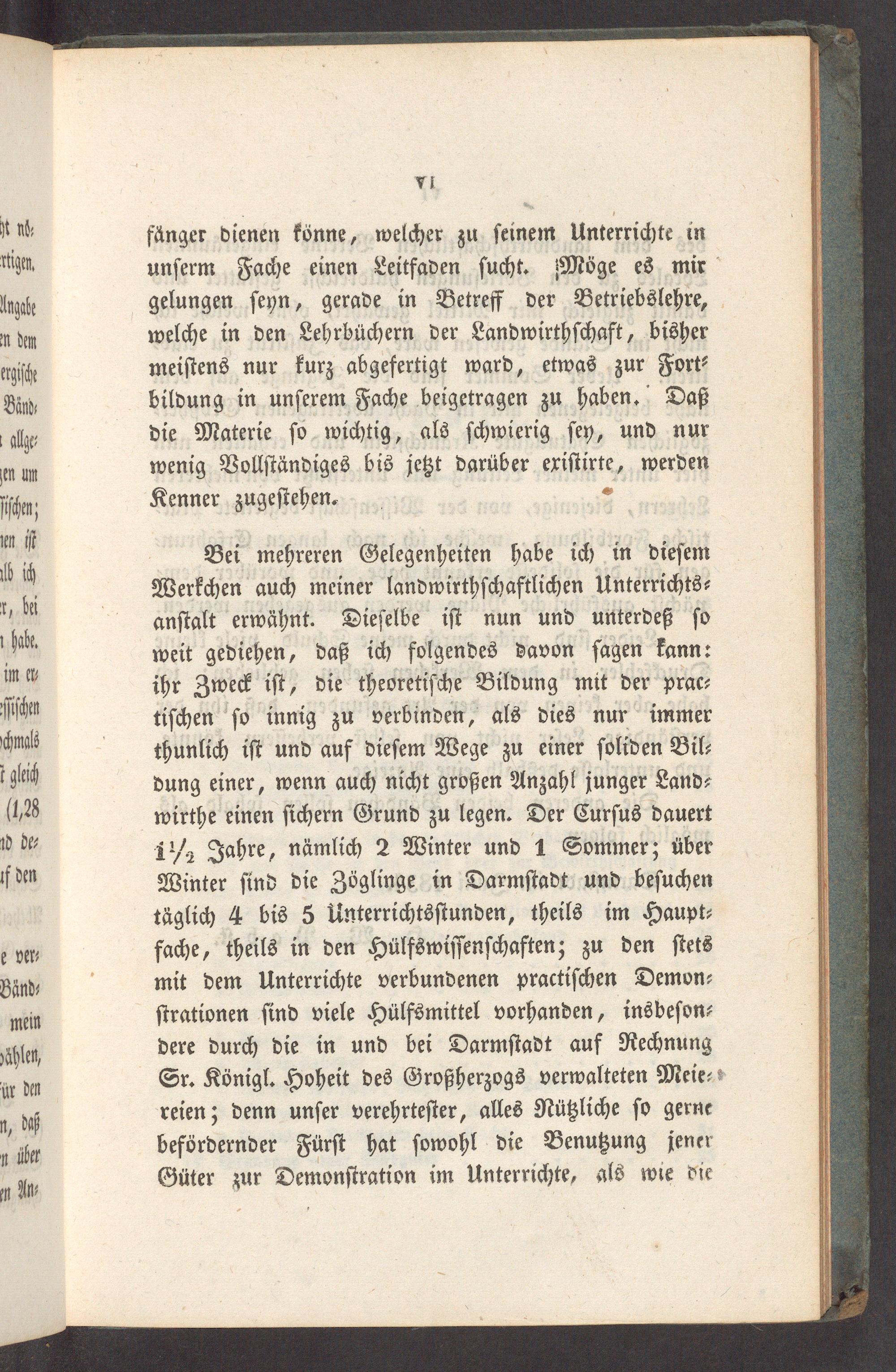 Bei mehreren Gelegenheiten habe ich in dieſem Werkchen auch meiner landwirthſchaftlichen Unterrichts⸗ anſtalt erwähnt. Dieſelbe iſt nun und unterdeß ſo weit gediehen, daß ich folgendes davon ſagen kann: ihr Zweck iſt, die theoretiſche Bildung mit der prac⸗ tiſchen ſo innig zu verbinden, als dies nur immer thunlich iſt und auf dieſem Wege zu einer ſoliden Bil⸗ dung einer, wenn auch nicht großen Anzahl junger Land⸗ wirthe einen ſichern Grund zu legen. Der Curſus dauert 1 ½ Jahre, nämlich 2 Winter und 1 Sommer; über Winter ſind die Zöglinge in Darmſtadt und beſuchen täglich 4 bis 5 Unterrichtsſtunden, theils im Haupt⸗ fache, theils in den Hülfswiſſenſchaften; zu den ſtets mit dem Unterrichte verbundenen practiſchen Demon⸗ ſtrationen ſind viele Hülfsmittel vorhanden, insbeſon⸗ dere durch die in und bei Darmſtadt auf Rechnung Sr. Königl. Hoheit des Großherzogs verwalteten Meie⸗ reien; denn unſer verehrteſter, alles Rützliche ſo gerne befördernder Fürſt hat ſowohl die Benutzung jener Güter zur Denontration; im Unterrichte, als wie die