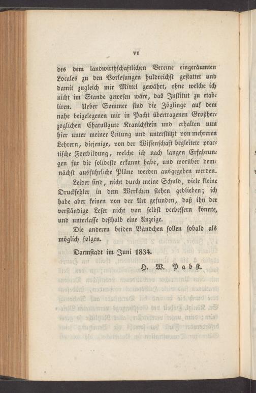 des dem landwirthſchaftlichen Vereine eingeraͤumten Locales zu den Vorleſungen huldreichſt geſtattet und damit zugleich mir Mittel gewährt, ohne welche ich nicht im Stande geweſen wäre, das Inſtitut zu etab⸗ liren. Ueber Sommer ſind die Zöglinge auf dem nahe beigelegenen mir in Pacht übertragenen Großher⸗ zoglichen Chatullgute Kranichſtein und erhalten nun hier unter meiner Leitung und unterſtützt von mehreren Lehrern, diejenige, von der Wiſſenſchaft begleitete prac⸗ tiſche Fortbildung, welche ich nach langen Erfahrun⸗ gen für die ſolideſte erkannt habe, und worüber dem⸗ nächſt ausführliche Pläne werden ausgegeben werden.