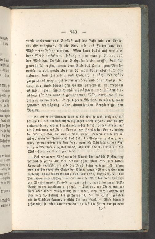 Bei der erſten Methode kann es ſich eben ſo wohl ereignen, daß der Miſt einen unverhältnißmäßig hohen Preiß erhält, wie es ſich ereignen kann, daß er beinahe gar nichts koſtet; beides iſt aber auf die Darſtellung des Rein⸗Ertrags der Grundbeſitz⸗Conto, welche den Miſt erhalten, von eminentem Eiufluſſe. Erſteres würde ſich er⸗ geben, wenn der Futterpreiß hoch ſteht, die Viehnutzung aber gering war, letzteres würde der Fall ſeyn, wenn die Viehhaltung das Fut⸗ ter zum Marktpreiß bezahlt macht, alſo kein Debet⸗ Saldo auf das Miſt⸗Conto zu übertragen bleibt.