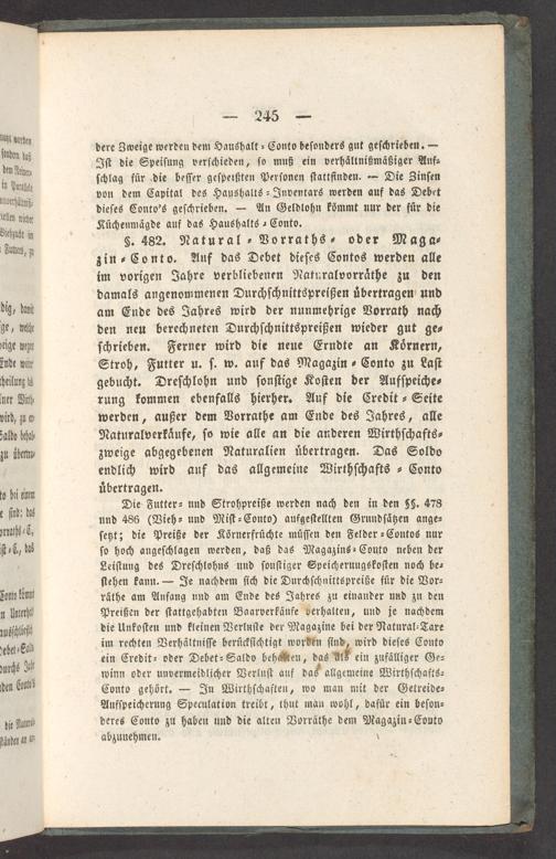 §. 482. Natural⸗Vorraths⸗ oder Maga⸗ zin⸗Conto. Auf das Debet dieſes Contos werden alle im vorigen Jahre verbliebenen Naturalvorraͤthe zu den damals angenommenen Durchſchnittspreißen uͤbertragen und am Ende des Jahres wird der nunmehrige Vorrath nach den neu berechneten Durchſchnittspreißen wieder gut ge⸗ ſchrieben. Ferner wird die neue Erndte an Koͤrnern, Stroh, Futter u. ſ. w. auf das Magazin⸗Conto zu Laſt gebucht. Dreſchlohn und ſonſtige Koſten der Aufſpeiche⸗ rung kommen ebenfalls hierher. Auf die Credit⸗Seite werden, außer dem Vorrathe am Ende des Jahres, alle Naturalverkaͤufe, ſo wie alle an die anderen Wirthſchafts⸗ zweige abgegebenen Naturalien uͤbertragen. Das Soldo endlich wird auf das allgemeine Wirthſchafts⸗Conto uͤbertragen.