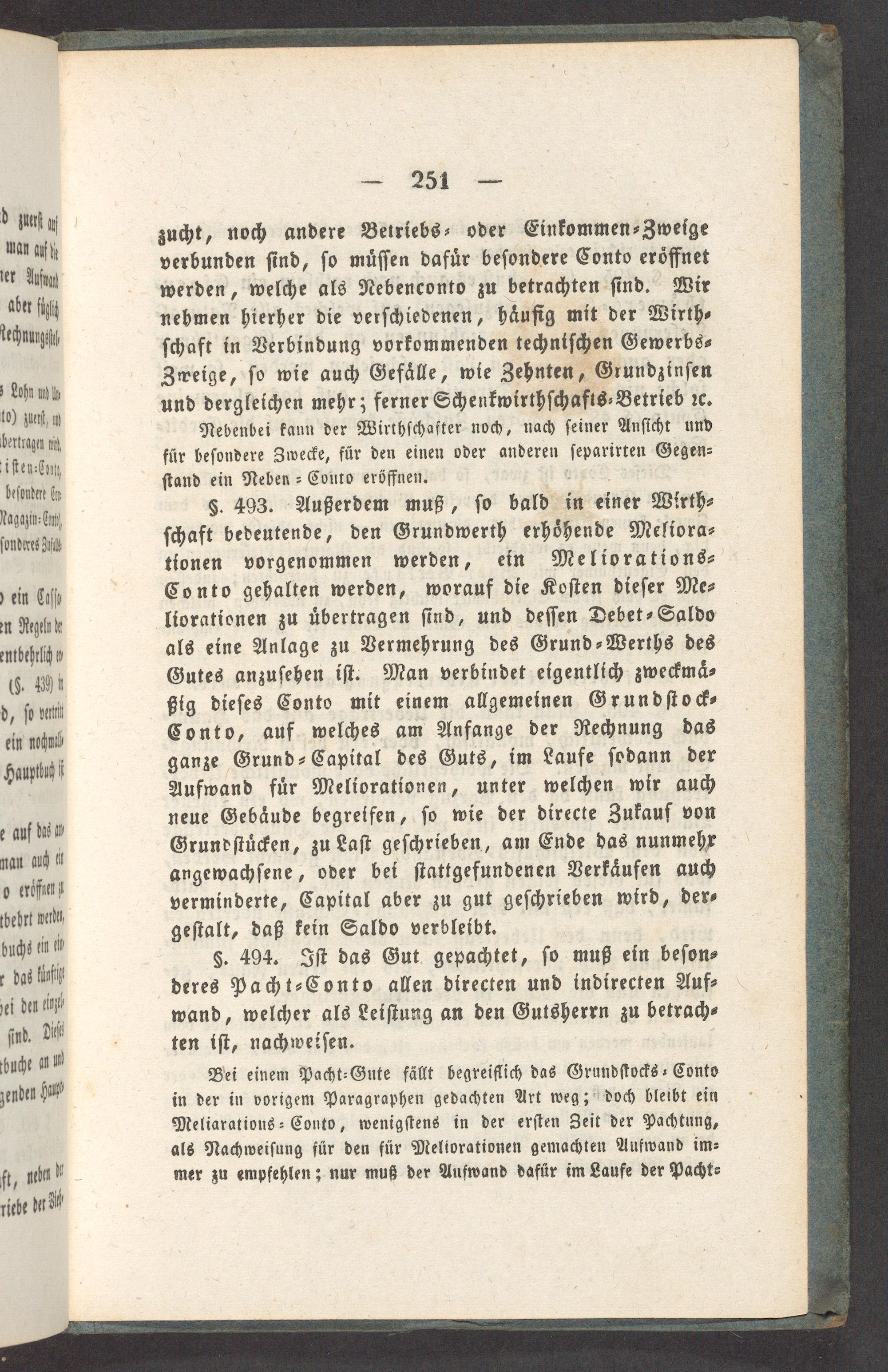§. 493. Außerdem muß, ſo bald in einer Wirth⸗ ſchaft bedeutende, den Grundwerth erhoͤhende Meliora⸗ tionen vorgenommen werden, ein Meliorations⸗ Conto gehalten werden, worauf die Koſten dieſer Me⸗ liorationen zu uͤbertragen ſind, und deſſen Debet⸗Saldo als eine Anlage zu Vermehrung des Grund⸗Werths des Gutes anzuſehen iſt. Man verbindet eigentlich zweckmaͤ⸗ ßig dieſes Conto mit einem allgemeinen Grundſtock⸗ Conto, auf welches am Anfange der Rechnung das ganze Grund⸗Capital des Guts, im Laufe ſodann der Aufwand fuͤr Meliorationen, unter welchen wir auch neue Gebaͤude begreifen, ſo wie der directe Zukauf von Grundſtuͤcken, zu Laſt geſchrieben, am Ende das nunmehr angewachſene, oder bei ſtattgefundenen Verkaͤufen auch verminderte, Capital aber zu gut geſchrieben wird, der⸗ geſtalt, daß kein Saldo verbleibt.