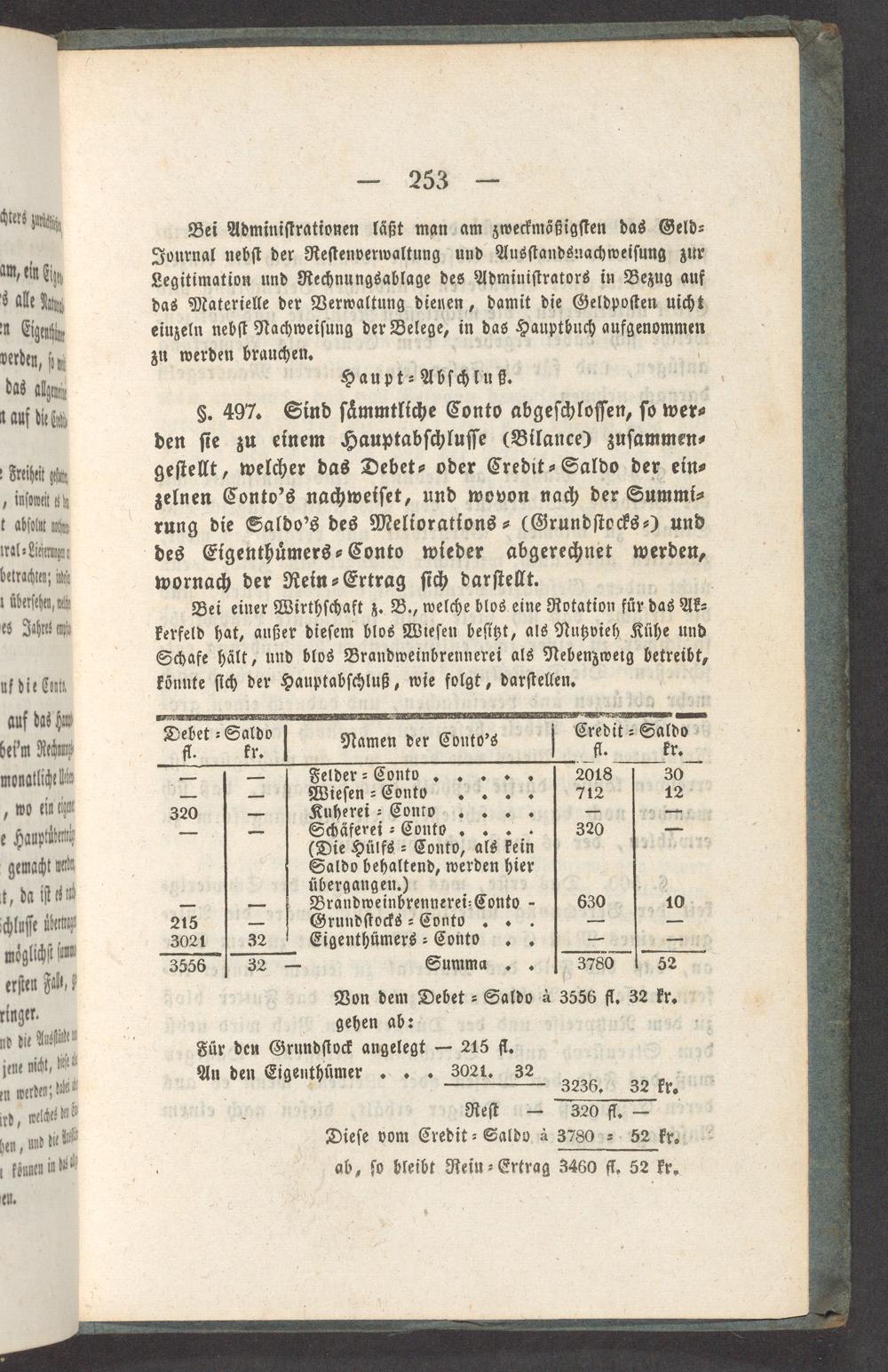 §. 497. Sind ſaͤmmtliche Conto abgeſchloſſen, ſo wer⸗ den ſie zu einem Hauptabſchluſſe(Bilance) zuſammen⸗ geſtellt, welcher das Debet⸗ oder Credit⸗Saldo der ein⸗ zelnen Conto's nachweiſet, und wovon nach der Summi⸗ rung die Saldo's des Meliorations⸗(Grundſtocks⸗) und des Eigenthuͤmers⸗Conto wieder abgerechnet werben, wornach der Rein⸗Ertrag ſich darſtellt..