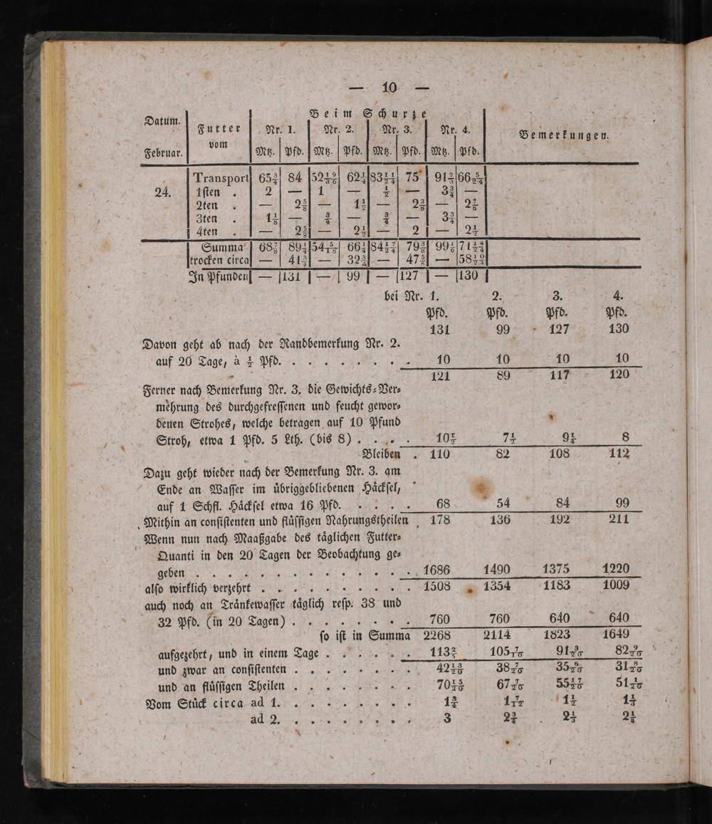 Datum. Beim Schurze Lutre Nr. 1 Nr. 2. Nr 3. Nr. 4. Bemerkungen. Februar. Mtz. Pfd. Mtz. Pfd. Mtz. Pfd.] Mtz. Pfd. Transpori 65 ¾ 84[52¼2)62183 ½ 4% 75]913 66 2 24. iſten 2— 1[— 4— 33— 2ten— 2= I1— 23]/— 24 3ten 43 1 347— 4ten— 24——= 2[— 24 Summaſ 08. 80 ſ57. 807S477ſ 79ſn trocken circa— 413½— 3241·.—— 47 31— 58 ½ In Pfundenſ— ſl31— 199— l127 1— 1130 bei Nr. 1. 2. 3. 4. Pfd. Pfd. Pfd. Pfd. . 131 99 14127 130 Davon geht ab nach der Randbemerkung Nr. 2 auf 20 Tage, à 4 Pfd.. 2 10 10 10 10 3 121 89 117 120 Ferner nach Bemerkung Nr. 3. die Gewichts⸗Ver⸗ mehrung des durchgefreſſenen und feucht gewor⸗ denen Strohes, welche betragen auf 10 Pfund 1 Stroh, etwa 1 Pfd. 5 Lth.(bis 8)... 10 ⅔ 7 ½ 9 ½ 8 . Bleiben 110 82 108 112 Dazu geht wieder nach der Bemerkung Nr. 3. am 4 Ende an Waſſer im uͤbriggebliebenen Haͤckſel, 41 auf 1 Schfl. Haͤckſel etwa 16 Pfd.... 68 7 54 84 99 Mithin an conſiſtenten und fluͤſſigen Nahrungstheilen, 178 136 192 211 Wenn nun nach Maaßgabe des taͤglichen Futter⸗ Duanti in den 20 Tagen der Beobachtung ge⸗ geben........ 1686 1490 1375 122⁰ alſo wirklich verzehrt. 1508„ 1354 1183 1009 auch noch an Traͤnkewaſſer taͤglich reſp. 38 und 32 Pfd.(in 20 Tagen)... 760 760 640 640 ſo iſt in Summa 2268 2114 1823 1649 aufgezehrt, und in einem Tage.. 113 105 G 912⁷ 82 ☛ und zwar an conſiſtenten.. 42 38 2G 35 ☛ 31 und an fluͤſſigen Theilen. 70 ½ 67 2 55 ν G 5127 Vom Stuͤck circa ad 1.. 1 ½ 1 m 1 1 ½ ad 2..... 3 2⅔ 2 ½ 4