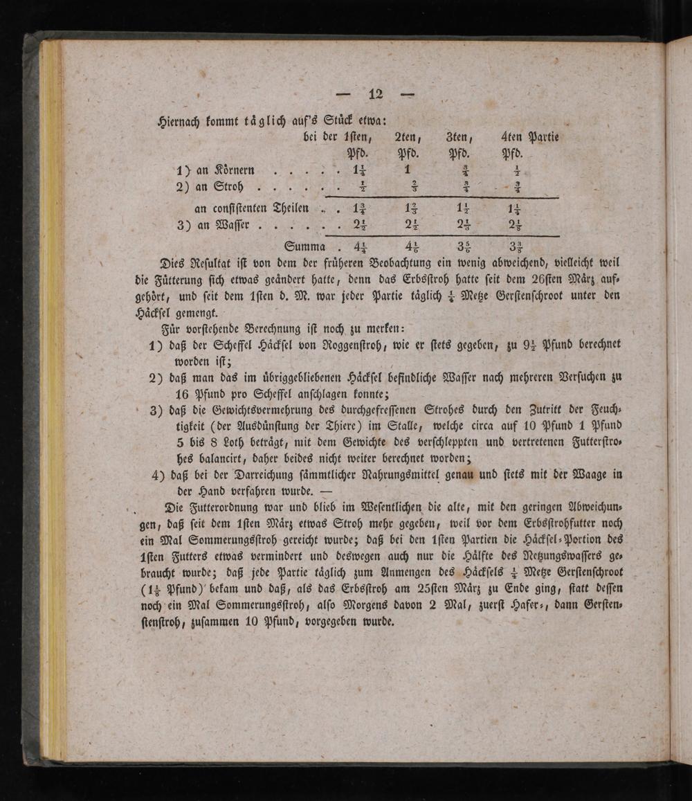 Dies Reſultat iſt von dem der fruͤheren Beobachtung ein wenig abweichend, vielleicht weil die Fuͤtterung ſich etwas geaͤndert hatte, denn das Erbsſtroh hatte ſeit dem 26ſten Maͤrz auf⸗ gehoͤrt, und ſeit dem 1ſten d. M. war jeder Partie taͤglich ½ Metze Gerſtenſchroot unter den Haͤckſel gemengt.