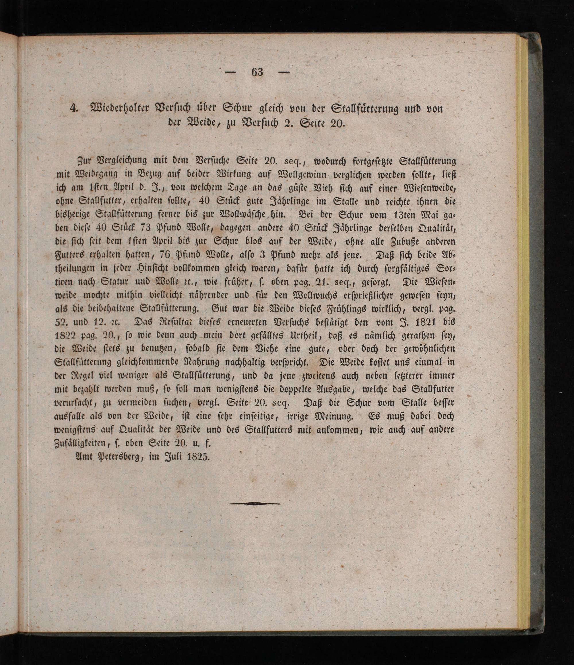 ohne Stallfutter, erhalten ſollte, 40 Stuͤck gute Jaͤhrlinge im Stalle und reichte ihnen die bisherige Stallfuͤtterung ferner bis zur Wollwaͤſche hin. Bei der Schur vom 13ten Mai ga⸗ ben dieſe 40 Stuͤck 73 Pfund Wolle, dagegen andere 40 Stuͤck Jaͤhrlinge derſelben Qualitaͤt, die ſich ſeit dem 1ſten April bis zur Schur blos auf der Weide, ohne alle Zubuße anderen Futters erhalten hatten, 76 Pfund Wolle, alſo 3 Pfund mehr als jene. Daß ſich beide Ab⸗ theilungen in jeder Hinſicht vollkommen gleich waren, dafuͤr hatte ich durch ſorgfaͤltiges Sor⸗ tiren nach Statur und Wolle ꝛc., wie fruͤher, ſ. oben pag. 21. seq., geſorgt. Die Wieſen⸗ weide mochte mithin vielleicht naͤhrender und fuͤr den Wollwuchs erſprießlicher geweſen ſeyn, als die beibehaltene Stallfuͤtterung. Gut war die Weide dieſes Fruͤhlings wirklich, vergl. pag. 52. und 12. ꝛc. Das Reſultat dieſes erneuerten Verſuchs beſtaͤtigt den vom J. 1821 bis 1822 pag. 20., ſo wie denn auch mein dort gefaͤlltes Urtheil, daß es naͤmlich gerathen ſey, die Weide ſtets zu benutzen, ſobald ſie dem Viehe eine gute, oder doch der gewoͤhnlichen Stallfuͤtterung gleichkommende Nahrung nachhaltig verſpricht. Die Weide koſtet uns einmal in der Regel viel weniger als Stallfuͤtterung, und da jene zweitens auch neben letzterer immer mit bezahlt werden muß, ſo ſoll man wenigſtens die doppelte Ausgabe, welche das Stallfutter verurſacht, zu vermeiden ſuchen, vergl. Seite 20. seq. Daß die Schur vom Stalle beſſer ausfalle als von der Weide, iſt eine ſehr einſeitige, irrige Meinung. Es muß dabei doch wenigſtens auf Qualitaͤt der Weide und des Stallfutters mit ankommen, wie auch auf andere Zufaͤlligkeiten, ſ. oben Seite 20. u. f.