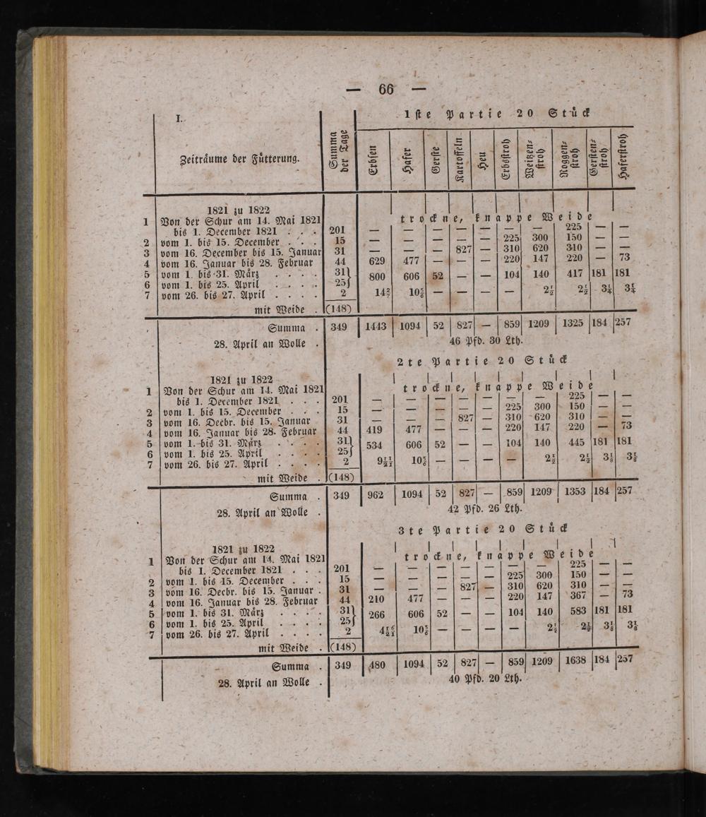 ᷣ 8—— F 5 4 4 1 8— A ttra 1 AASe Zeitraͤume der Futterung. 52==2. 4 S2 — 5——₰½ 2=—28 6 A.[5S 5 3 5 2. 1821 zu 1822 1 Von der Schur am 14. Mai 1821 trockne, knappe We de bis 1. December 1821... 201————— 1— 2 vom 1. bis 15. December. 15————— 225 300 220—— 3 vom 16. December bis 15. Januar 31—-—— 827— 310 620 310—— 4 vom 16. SSanbüt 3 28. Februar 44 629 477——— 220 147 220— 73 vom 1. bis 31. Maͤrz 31 4. 2— 5 6 ſvom 1. bis 25. April 29 800 606 52—— 104 140 417 181 181 7 vom 26. bis 27. April 2 14 10———— 2 ½ 2 ½ 3 ½ 3 ½ mit Weide(148) Summa.349 1443 1094 52 827— 859 1209 1325 184 257 28, April an Wolle. 46 Pfd. 30 Lth. — 2te Partie 20 St ç ck 1821 zu 1822 14 Ll 15 1 Ton der Cahar um 22 Mai 1821 to c n e, kna p pe Weide bis 1. December 1821. 201— 225—— 2 vom 1. bis 15. December 15——— 225 300 150—— 3 vom 16. Decbr. bis 15. Januar 31——— 827— 310 620 310—— 4 vom 16. Januar bis 28. Februar 44 419 477—— 220 ßy147 220— 73 5 vom 1. bis 31. M..31 1. 1 5. vomn 1. bis l. Min 29) 534 606 52—— 104 140] 445 181 181 7 vom 26. bis 27. April 2 9 10= 2 ⅔ 2 ½ 3 3 mmit Weide(148) Summa 349 962 1094 52 827— 859 1209] 1353 184 257 28. April an Wolle 42 Pfd. 26 Lth. 3te Partie 20 Stuͤck 1821 zu 1822 1 41 1 Von der Schur am 14. Mai 1821 trockne, kna 2 pe Weid bis 1. December 1821. 201————— 225—— 2 vom 1. bis 15. December 4. 15———— 225 300 150—— 3 vom 16. Decbr. bis 15. Januar. 31——— 827— 310 620 310—— 4 vom 16. Januar bis 28. Sebruar 44 210 477——— 220 147 367— 73 5 vom 1. bis 31. Maͤrz. 31— ³ vom 1 z0 31. Nei 2⁰) 266 606 52— 104 140 583 181 181 7 vom 26. bis 27. April 2 4½ 10———— 2½ 2 3 3 mit Weide(148) — Summa 349 480 1094 52 827— 859 1209 1638 184 257