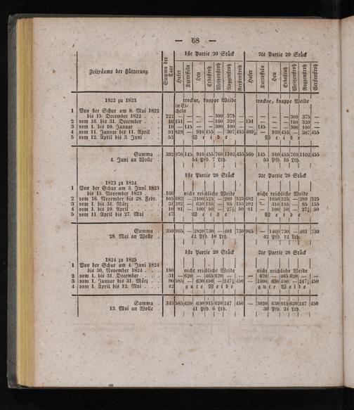 4 1 . lſte Partie 20 Stuͤck 2te Partie 20 Stuͤck 8 1 4——— jerunge ber Kutert 1 Zeitraͤume 4 Fuͤtterung. 55 2** SAEA 5 5 8 5 5=s s K 5S 5 ü S .— 1822 zu 1823 4 Crvoſe, knappe Weide trockne, knappe Weide in Ei⸗ Von der Schur am 8. Mai 1822 cheln 5 bis 15. December 1822. 2227———— 300 375——— ·—— 300 375— vom 16. bis 31. December. 161151——— 160 320— 151——-— 160 320— vom 1. bis 10. Januar. 10%— 145—— 300 100——[145——[300 100— vom 11. Januar bis 11. April 91]819— 910ʃ455]— 307455]409 ½— 910]455]— 307 455 vom 12. April bis 3. Juni. 53 V W e 1d e W ei b e Summa 392¹970,145 910/,455 760 I102)455 560[145 9106557601102 455 4. Juni an Wolle 54 Pfd. 7 Lth. 53 Pfd. 16 Lth. l i Iſte Partie 20 Stuͤck 2te Partie 20 Stuͤck 1823 zu 1824—, Von der Schur am 3. Juni 1823. 1. 5. bis 15. November 1823. 166] nicht reichliche Weide nicht reichliche Weide vom 16. November bis 28. deüt. 105 682— 933— 289 525/682— 1050 525'— 239 525 vom 1. bis 31. Maͤrz. 31]202— 620/155— 85 155] 202— 310/155— 155 vom 1. bis 10. April.. 10 81]— 100] 50 27 ½ 50 81 26 100 5 23 50 vom 11. April bis 27. Mai 47 Wei F. e Ll.. 25 61 Summa 359 965—hesdr uor 730 965— 2 1e0 28. Mai an Wolle 42 Pfd. 10 Lth. 42 Pfd. 12 Lth. 3 1 1. 1 ſte Partie 20 Stuͤck 2te Partie 20 Stuͤck 1824 zu 1825 1 Von der Schur am 4. Juni 1824 3 1.. bis 30. November 1824.. 180 nicht reichliche Weide nnicht reichliche Weide 2 vom 1. bis 31. December.. 31]— 620 465 679. 85 620 465 629 3 vom 1. Januar bis 31. Maͤrz. 90585— 630 450 2472450— 2400 630 450 1206 450 4 vom 1. April bis 12. Mai. 42 Sute Me id e laute ei de 1. 1 Summa 343 58 620 GS6ols 620 247 15o— 3029 630818620,24, 450 13. Mai an Wolle 4
