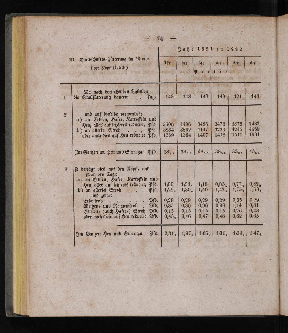 4 3te 4te 5te 6te (per Kopf taͤglich) 46 ν 4 . Spart ie Da nach vorſtehenden Tabellen 4 1 die Stallfuͤtterung dauerte, Tage 148 148 ſ 148 148] 121 148 und auf dieſelbe verwendet: I a) an Erbſen, Hafer, Kartoffeln und Heu, alles auf letzteres reducirt, Pfd. 5506 4496 3486 2476 1875 2433 b) an allerlei Stroh. Pfd. 3834 3862 4147 4220 4245 4689 oder auch dies auf Heu reducirt Pfd.] 1359 1364 1407 1418 1510 1931 Im Ganzen an Heu und Surrogat Pfd. 686 5860 483 4 384] 338 5] 4364 ſo betraͤgt dies auf den Kopf, und zwar pro Tag: a) an Erbſen, Hafer, Kartoffeln und Heu, alles auf letzteres reducirt, Pfd.] 1,86 1,51. 1,18 0,83. 0,77 0,822 b) an allerlei Stroh. Pfd. 1,295 1,304 1,40 1,42 1,754 1,584 und zwar: Erbsſtrop...... Pfd. 0,29 0,29 0,29 0,29 0,35 0,29 Weitzen⸗ und Roggenſtroh. Pfd. 0,85 0,86 0,96 0,98 1,14 0,81 Gerſten⸗(auch Hafer⸗) Stroh Pfd. 0,15 0,15 0,15 0,15 0,26 0,48 oder auch dieſe auf Heu reducirt Pfd. 0,455] 0,46 0,47 0,48 0,62 0,65