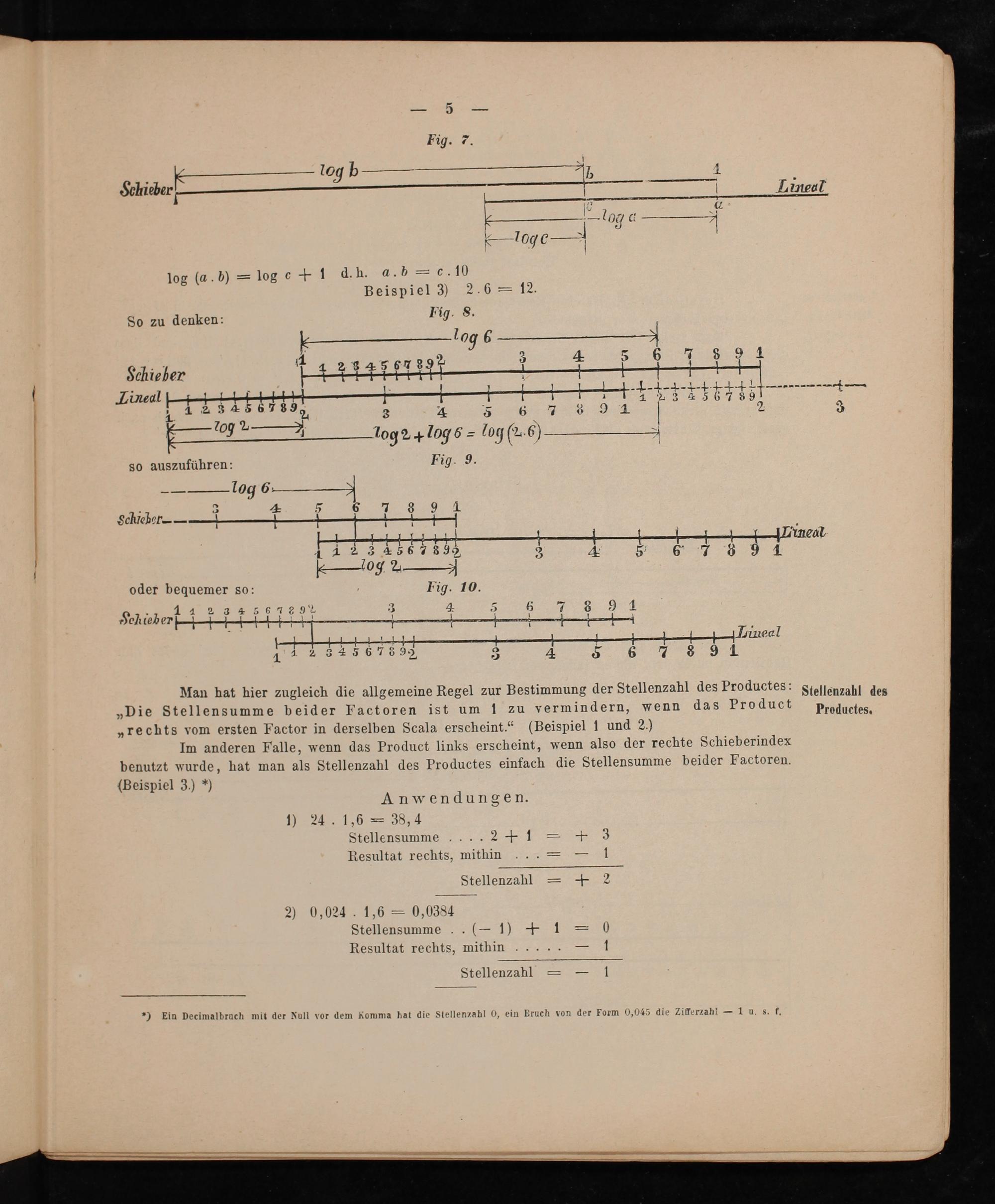 Im anderen Falle, wenn das Product links erscheint, wenn also der rechte Schieberindex benutzt wurde, hat man als Stellenzahl des Productes einfach die Stellensumme beider Factoren. (Beispiel 3.)*)