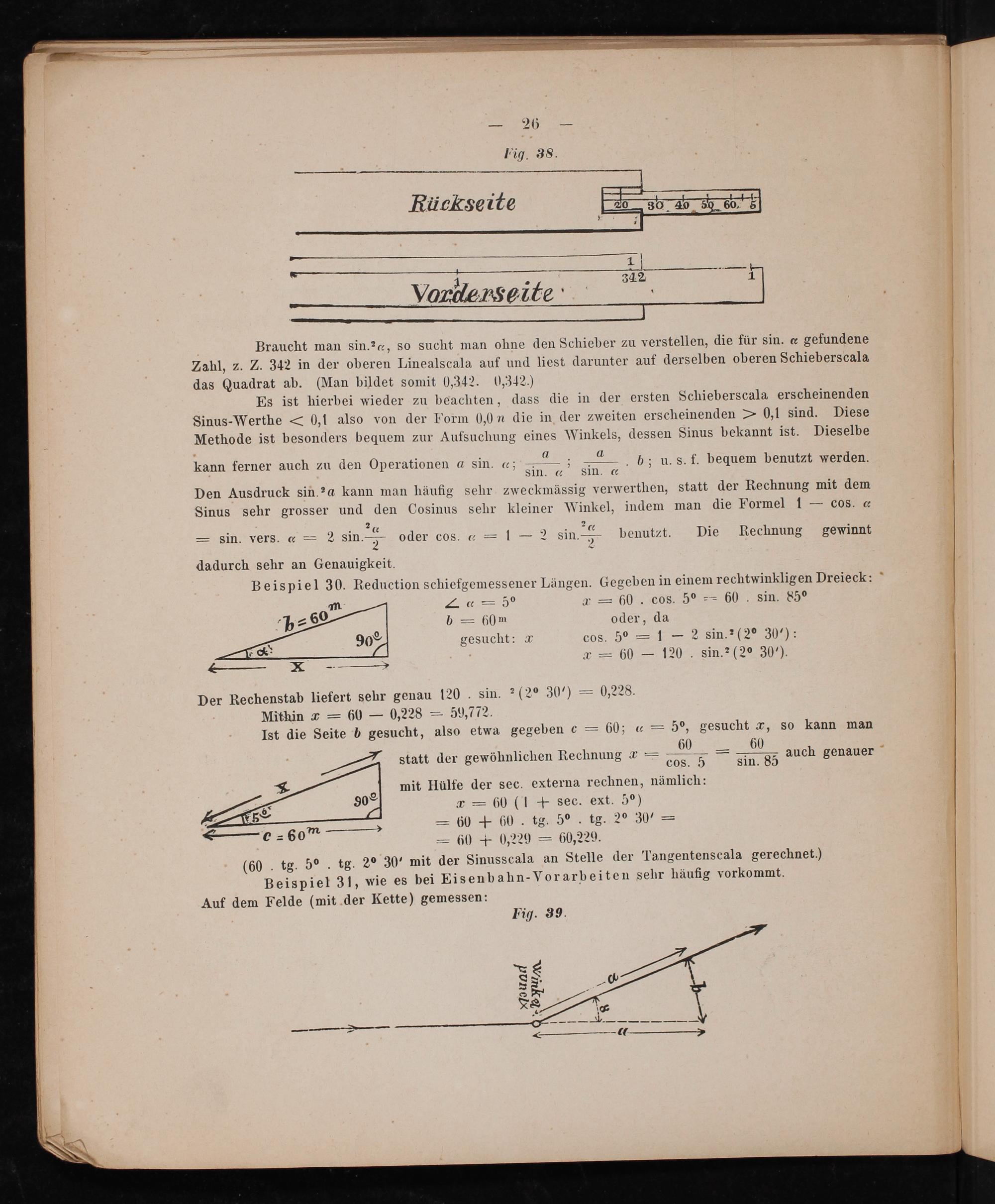 dadurch sehr an Genauigkeit. Beispiel 30. Reduction schiefgemessener Längen. Gegeben in einem rechtwinkligen Dreieck: