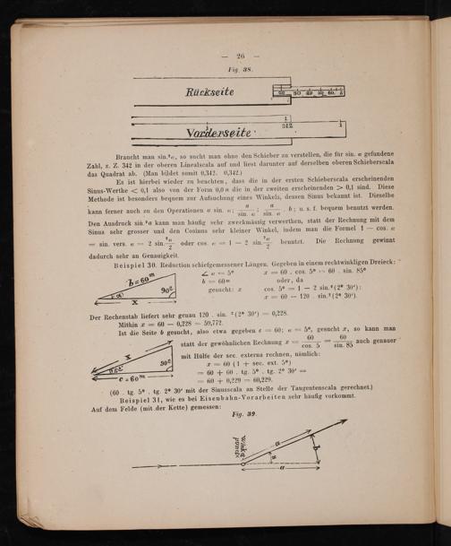 Es ist hierbei wieder zu beachten, dass die in der ersten Schieberscala erscheinenden Sinus-Werthe= 0,1 also von der Form 0,0 n die in der zweiten erscheinenden= 0,1 sind. Diese Methode ist besonders bequem zur Aufsuchung eines Winkels, dessen Sinus bekannt ist. Dieselbe