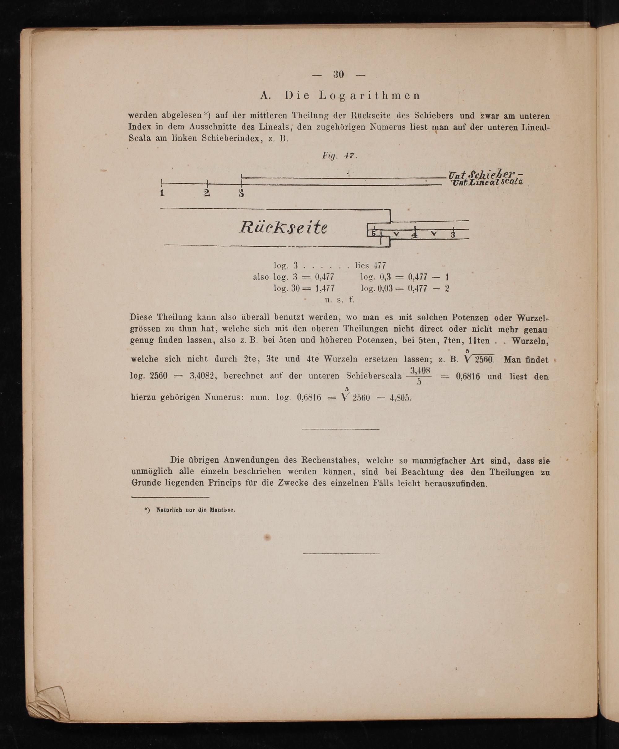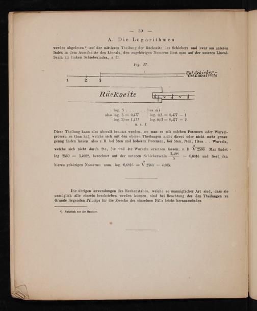 Die übrigen Anwendungen des Rechenstabes, welche so mannigfacher Art sind, dass sie unmöõglich alle einzeln beschrieben werden können, sind bei Beachtung des den Theilungen zu Grunde liegenden Princips für die Zwecke des einzelnen Falls leicht herauszufinden.