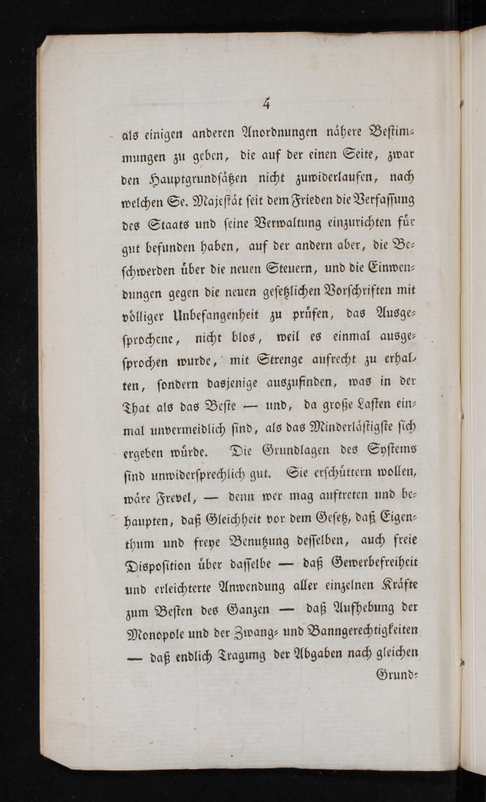 als einigen anderen Anordnungen naͤhere Beſtim⸗ mungen zu geben, die auf der einen Seite, zwar den Hauptgrundſaͤtzen nicht zuwiderlaufen, nach welchen Se. Majeſtaͤt ſeit dem Frieden die Verfaſſung des Staats und ſeine Verwaltung einzurichten fuͤr gut befunden haben, auf der andern aber, die Be⸗ ſchwerden uͤber die neuen Steuern, und die Einwen⸗ dungen gegen die neuen geſetzlichen Vorſchriften mit voͤlliger Unbefangenheit zu pruͤfen, das Ausge⸗ ſprochene, nicht blos, weil es einmal ausge— ſprochen wurde, mit Strenge aufrecht zu erhal⸗ ten, ſondern dasjenige auszufinden, was in der That als das Beſte— und, da große Laſten ein— mal unvermeidlich ſind, als das Minderlaͤſtigſte ſich ergeben wuͤrde. Die Grundlagen des Syſtems ſind unwiderſprechlich gut. Sie erſchuͤttern wollen, waͤre Frevel,— denn wer mag auftreten und be⸗ haupten, daß Gleichheit vor dem Geſetz, daß Eigen⸗ thum und freye Benutzung deſſelben, auch freie Dispoſition uͤber daſſebe— daß Gewerbefreiheit und erleichterte Anwendung aller einzelnen Kraͤfte zum Beſten des Ganzen— daß Aufhebung der Monopole und der Zwang⸗ und Banngerechtigkeiten
