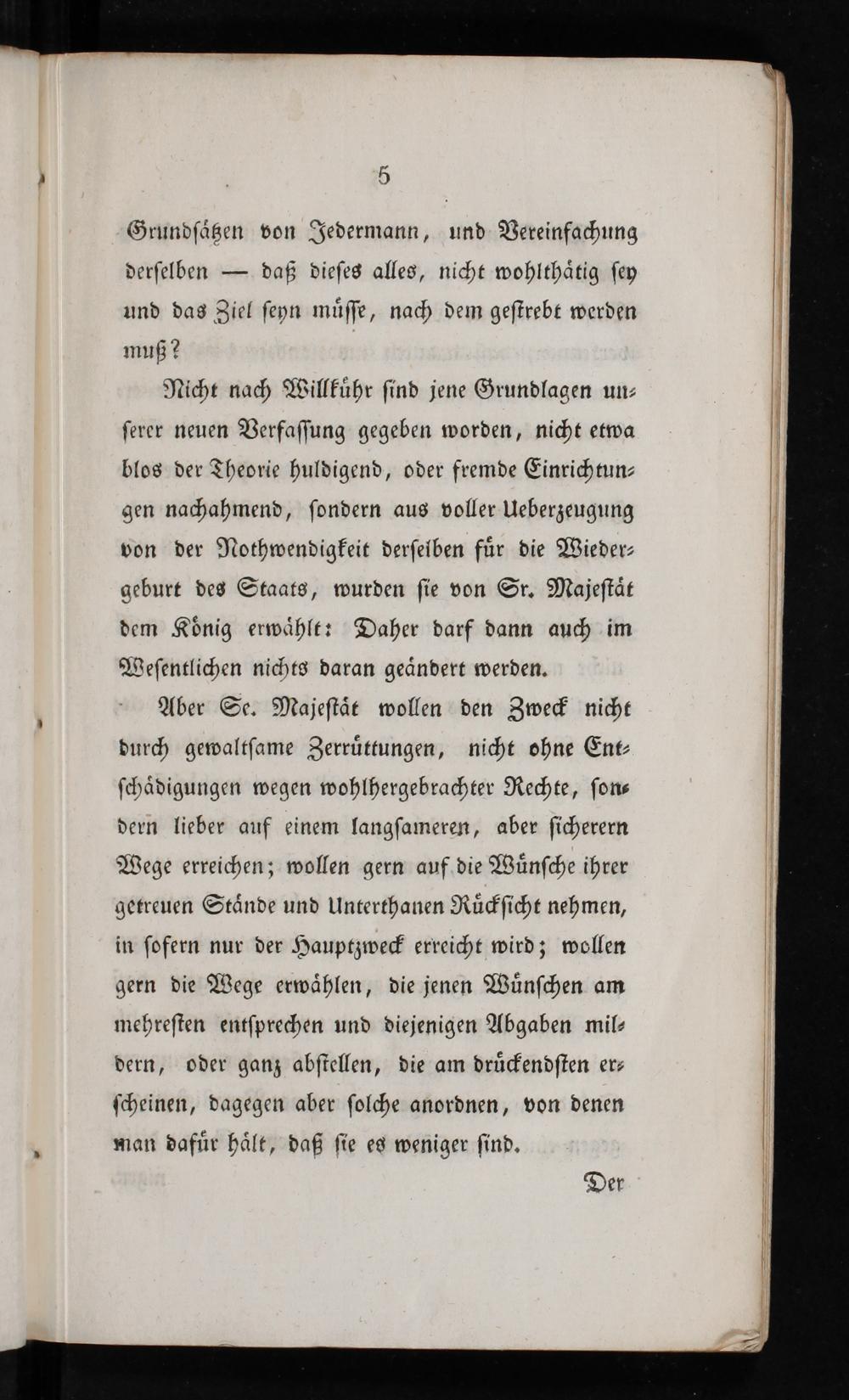 Aber Se. Majeſtaͤt wollen den Zweck nicht durch gewaltſame Zerruͤttungen, nicht ohne Ent⸗ ſchaͤdigungen wegen wohlhergebrachter Rechte, ſon⸗ dern lieber auf einem langſameren, aber ſicherern Wege erreichen; wollen gern auf die Wuͤnſche ihrer getreuen Staͤnde und Unterthanen Ruͤckſicht nehmen, in ſofern nur der Hauptzweck erreicht wird; wollen gern die Wege erwaͤhlen, die jenen Wuͤnſchen am mehreſten entſprechen und diejenigen Abgaben mil⸗ dern, oder ganz abſtellen, die am druͤckendſten er— ſcheinen, dagegen aber ſolche anordnen, von denen man dafuͤr haͤlt, daß ſie es weniger ſind.