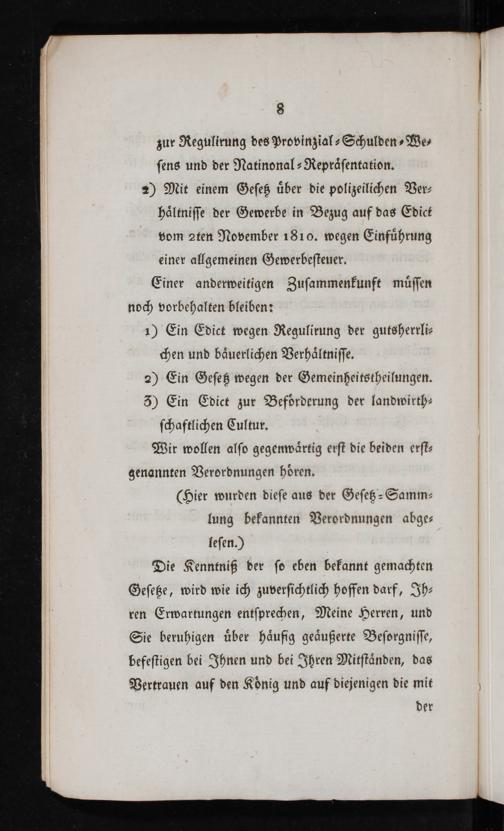 Die Kenntniß der ſo eben bekannt gemachten Geſetze, wird wie ich zuverſichtlich hoffen darf, Ih⸗ ren Erwartungen entſprechen, Meine Herren, und Sie beruhigen uͤber haͤufig geaͤußerte Beſorgniſſe, befeſtigen bei Ihnen und bei Ihren Mitſtaͤnden, das Vertrauen auf den Koͤnig und auf diejenigen die mit