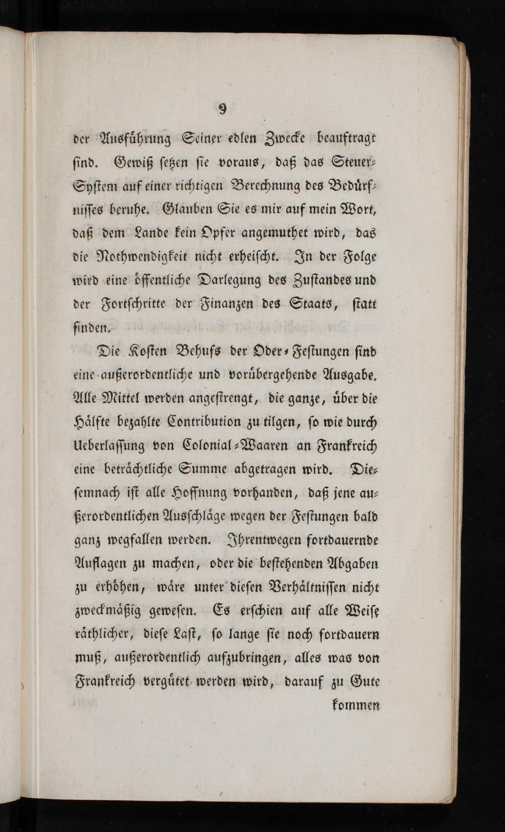 Die Koſten Behufs der Oder⸗Feſtungen ſind eine außerordentliche und voruͤbergehende Ausgabe. Alle Mittel werden angeſtrengt, die ganze, uͤber die Haͤlfte bezahlte Contribution zu tilgen, ſo wie durch Ueberlaſſung von Colonial⸗Waaren an Frankreich eine betraͤchtliche Summe abgetragen wird. Die⸗ ſemnach iſt alle Hoffnung vorhanden, daß jene au— ßerordentlichen Ausſchlaͤge wegen der Feſtungen bald ganz wegfallen werden. Ihrentwegen fortdauernde Auflagen zu machen, oder die beſtehenden Abgaben zu erhoͤhen, waͤre unter dieſen Verhaͤltniſſen nicht zweckmaͤßig geweſen. Es erſchien auf alle Weiſe raͤthlicher, dieſe Laſt, ſo lange ſie noch fortdauern muß, außerordentlich aufzubringen, alles was von Frankreich verguͤtet werden wird, darauf zu Gute