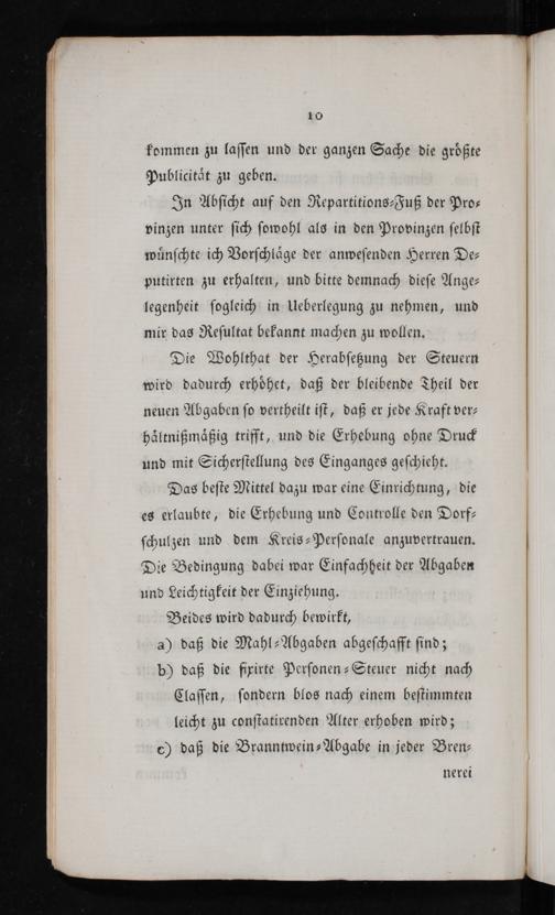 In Abſicht auf den Repartitions-Fuß der Pro⸗ vinzen unter ſich ſowohl als in den Provinzen ſelbſt wuͤnſchte ich Vorſchlaͤge der anweſenden Herren De— putirten zu erhalten, und bitte demnach dieſe Ange⸗ legenheit ſogleich in Ueberlegung zu nehmen, und mir das Reſultat bekannt machen zu wollen.