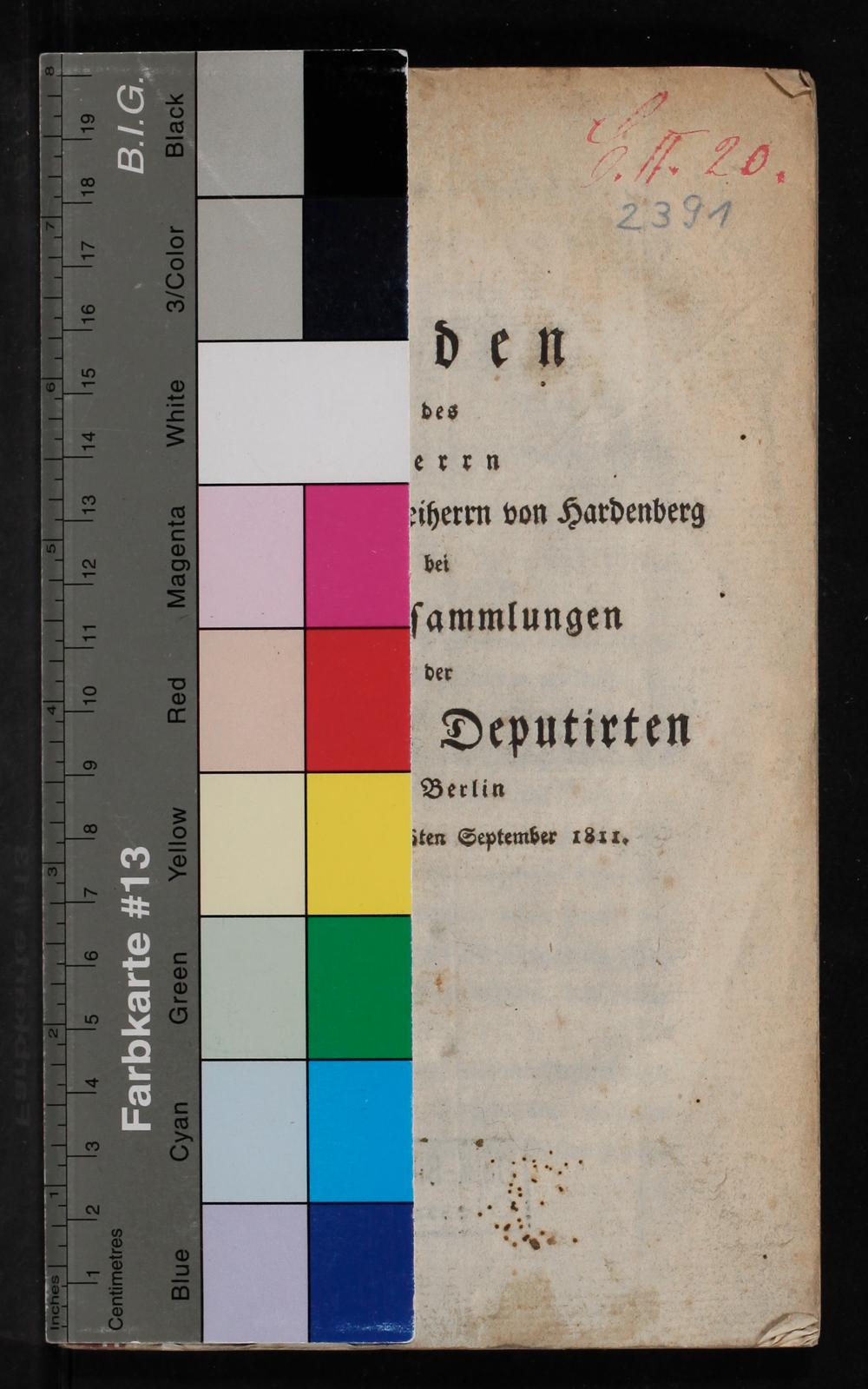 Farbkarte 13 den des errn. eiherrn von Hardenberg bei ſammlungen der Deputirten Berlin iten September 1811.