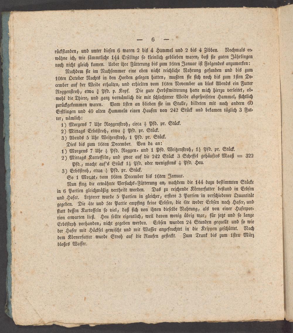 zuruͤckgekommen waren. Vom 1ſten an blieben ſie im Stalle, bildeten mit noch andern 60 Erſtlingen und 40 alten Hammeln einen Haufen von 242 Stuͤck und bekamen taͤglich 3 Fut⸗ ter, naͤmlich: 3 4 1) Morgens 7 Uhr Roggenſtroh, circa ½ Pfd. pr. Stuͤck. 2) Mittags Erbsſtroh, etwa ³½ Pfd. pr. Stuͤck. 3) Abends 5 Uhr Weitzenſtroh, 1 Pfd. pr. Stuͤk. Dies bis zum 16ten December. Von da an: