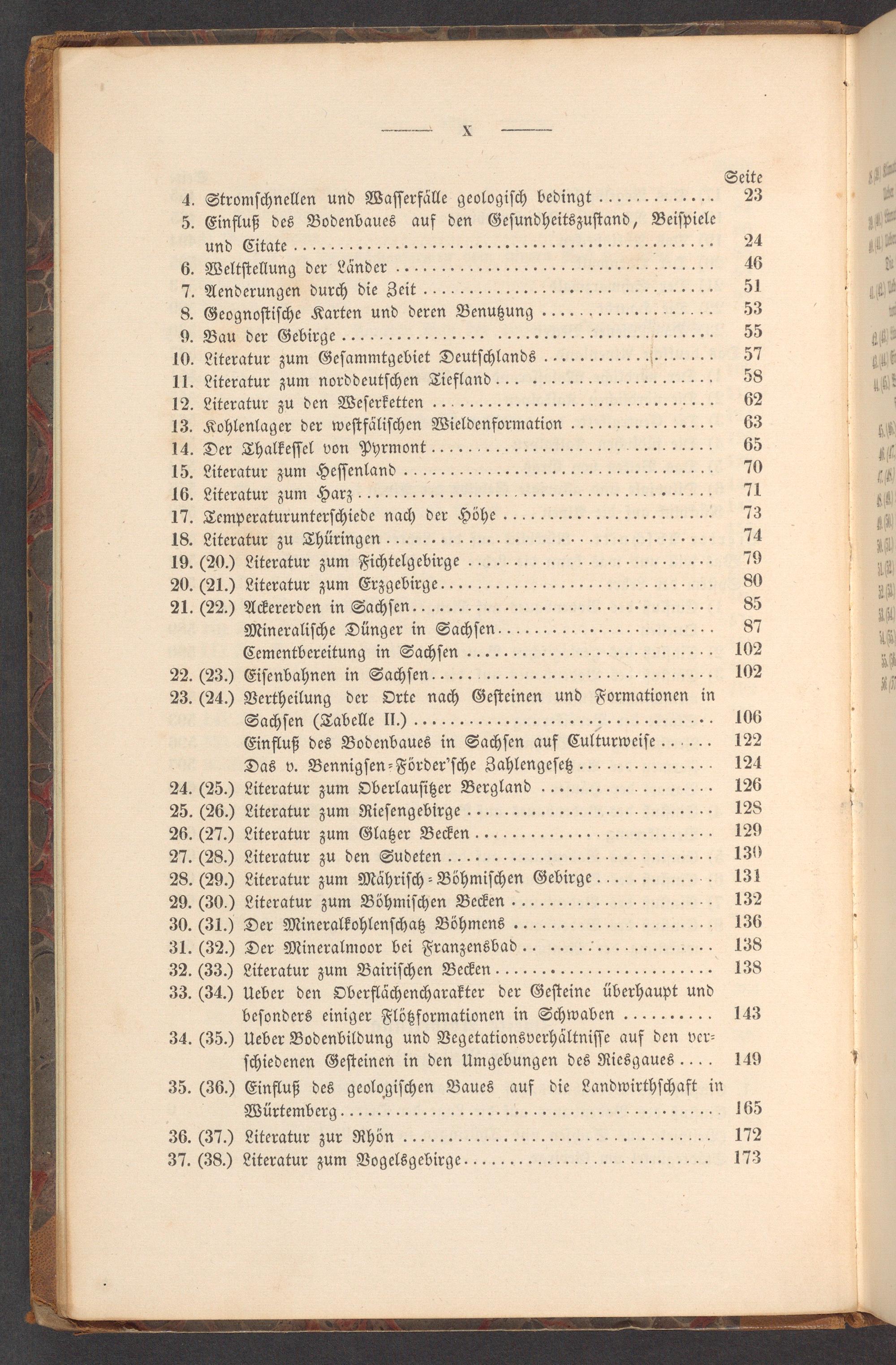 — x— Seite 84 4. Stromſchnellen und Waſſerfälle geologiſch bedingt........... 23. 2 5. Einfluß des Bodenbaues auf den Geſundheitszuſtand, Beiſpiele und Eitate............................................. 24 40 ¹s 6. Weltſtellung der Länder............................... 46 8 7. Aenderungen durch die Zeiitt.. 51. 109 8. Geognoſtiſche Karten und deren Benutzung............... 53 46 9. Bau der Gebirge........................ 55 A0 10. Literatur zum Geſammtgebiet Deutſchlands.................. 57 aut 11. Literatur zum norddeutſchen Tiefland..................... 58 uüd 12. Literatur zu den Weſerketten........./..:.............. 62 1 13. Kohlenlager der weſtfäliſchen Wieldenformation................ 63 14. Der Thalkeſſel von Pyrmont........................... 65 49 15. Literatur zum Heſſenland................................... 70 18 16. Literatur zum Harz.............................. 71 36 17. Temperaturunterſchiede nach der Höhe......⁊................ 73 4 18. Literatur zu Thüringen............................. 74 1 19.(20.) Literatur zum Fichtelgebirge.......................... 79 1 20.(21.) Literatur zum Erzgebirge......................... 80 äA 21.(22.) Ackererden in Sachſen................... 85 1 Mineraliſche Dünger in Sachſen.......... ⁊)........... 87 Cementbereitung in Sacſeen)n.... 102 22.(23.) Eiſenbahnen in Sachſen............................. 102 25 23.(24.) Vertheilung der Orte nach Geſteinen und Formationen in Fi Sachſen(Fabelle II.)........ 106 Einfluß des Bodenbaues in Sachſen auf Culturweiſe..... 122 Das v. Bennigſen⸗Förder'ſche Zahlengeſetz............... 124. 24.(25.) Literatur zum Oberlauſitzer Bergland................. 126. 25.(26.) Literatur zum Rieſengebirge...........:...... 128 26.(27.) Literatur zum Glatzer Becken........................ 129 27.(28.) Literatur zu den Sudeten........./..... 130 28.(29.) Literatur zum Mähriſch⸗Böhmiſchen Gebirge............. 131 29.(30.) Literatur zum Böhmiſchen Becken...................... 13²2 30.(31.) Der Mineralkohlenſchatz Böhmens..................... 136 31.(32.) Der Mineralmoor bei Franzensbad.................... 138 32.(33.) Literatur zum Bairiſchen Becken....................... 138 33.(34.) Ueber den Oberflächencharakter der Geſteine überhaupt und beſonders einiger Flötzformationen in Schwaben.......... 143 34.(35.) Ueber Bodenbildung und Vegetationsverhältniſſe auf den ver⸗ ſchiedenen Geſteinen in den Umgebungen des Riesgaues.... 149 35.(36.) Einfluß des geologiſchen Baues auf die Landwirthſchaft in Würtemberg................................... 165 36.(37.) Literatur zur Rhön................................ 172 37.(38.) Literatur zum Vogelsgebirge!...........:........ 173