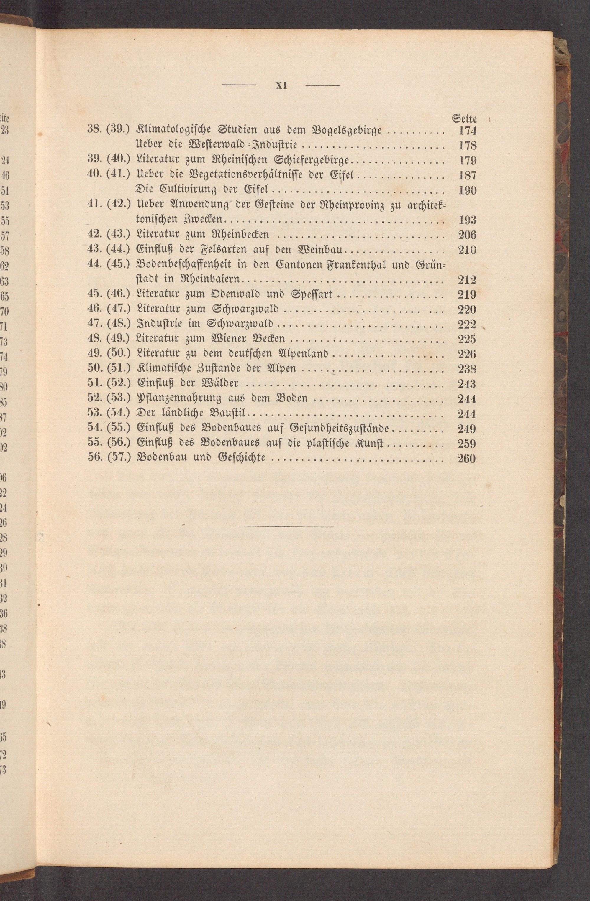 Seite 38.(39.) Klimatologiſche Studien aus dem Vogelsgebirge.......... 174 Ueber die Weſterwald⸗Induſtrie........................ 178 39.(40.) Literatur zum Rheiniſchen Schiefergebirge!............... 179 40.(41.) Ueber die Vegetationsverhältniſſe der Eifel............... 187 Die Cultivirung der Eifel..../........................ 190 41.(42.) Ueber Anwendung der Geſteine der Rheinprovinz zu architek⸗ toniſchen Zwecken................................... 193 42.(43.) Literatur zum Rheinbecken............:.............. 206 43.(44.) Einfluß der Felsarten auf den Weinbau................. 210 44.(45.) Bodenbeſchaffenheit in den Cantonen Frankenthal und Grün⸗ ſtadt in Rheinbaieyn................................. 212 45.(46.) Literatur zum Odenwald und Speſſart.................. 219 46.(47.) Literalur zum Schwarzwald................ ͤ...... 220 47.(48.) Induſtrie im Schwarzwald....................... 222 48.(49.) Literatur zum Wiener Becken........:).............. 225 49.(50.) Literatur zu dem deutſchen Alpenland................... 226 50.(51.) Klimatiſche Zuſtande der Alpen....................... 238 51.(52.) Einfluß der Wälder................................ 243 52.(53.) Pflanzennahrung aus dem Boden...................... 244 53.(54.) Der landliche Bauſtil.............................. 244 54.(55.) Einfluß des Bodenbaues auf Geſundheitszuſtäͤnde......... 249 55.(56.) Einfluß des Bodenbaues auf die plaſtiſche Kunſt.......... 259 56.(57.) Bodenbau und Geſchichte........................... 260