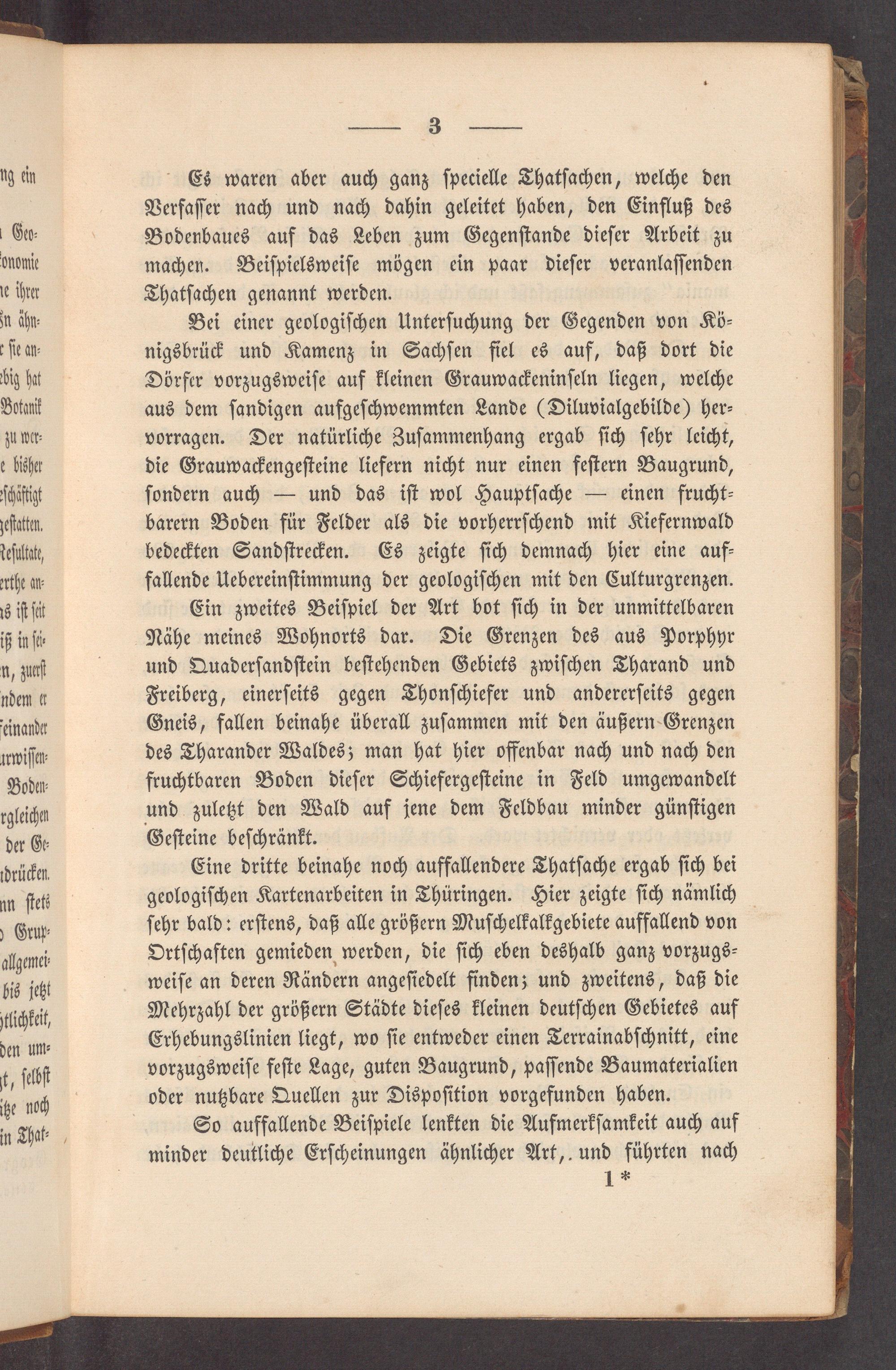 Eine dritte beinahe noch auffallendere Thatſache ergab ſich bei geologiſchen Kartenarbeiten in Thüringen. Hier zeigte ſich nämlich ſehr bald: erſtens, daß alle größern Muſchelkalkgebiete auffallend von Ortſchaften gemieden werden, die ſich eben deshalb ganz vorzugs⸗ weiſe an deren Rändern angeſiedelt finden; und zweitens, daß die Mehrzahl der größern Städte dieſes kleinen deutſchen Gebietes auf Erhebungslinien liegt, wo ſie entweder einen Terrainabſchnitt, eine