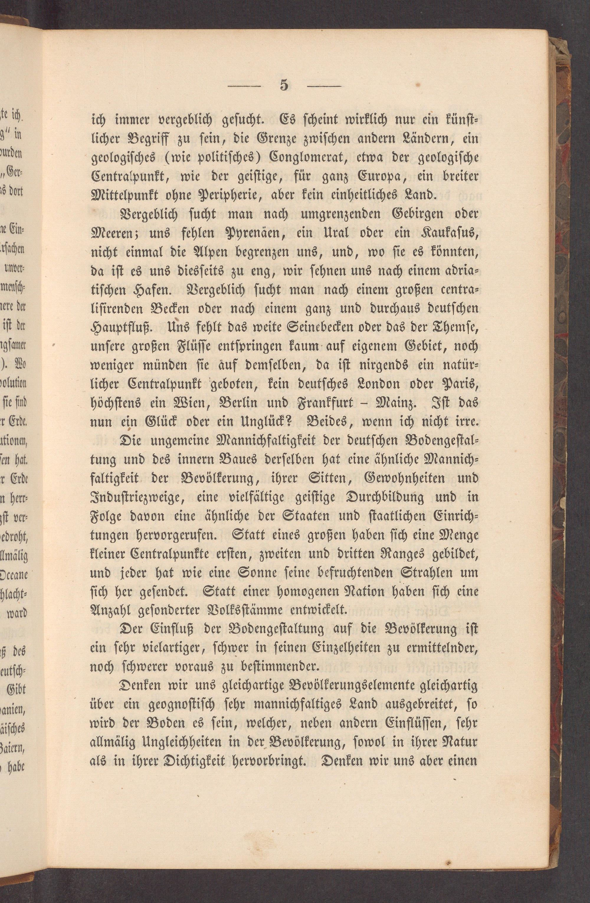 Die ungemeine Mannichfaltigkeit der deutſchen Bodengeſtal⸗ tung und des innern Baues derſelben hat eine ähnliche Mannich⸗ faltigkeit der Bevölkerung, ihrer Sitten, Gewohnheiten und Induſtriezweige, eine vielfältige geiſtige Durchbildung und in Folge davon eine ähnliche der Staaten und ſtaatlichen Einrich⸗ tungen hervorgerufen. Statt eines großen haben ſich eine Menge kleiner Centralpunkte erſten, zweiten und dritten Ranges gebildet, und jeder hat wie eine Sonne ſeine befruchtenden Strahlen um ſich her geſendet. Statt einer homogenen Nation haben ſich eine Anzahl geſonderter Volksſtämme entwickelt.
