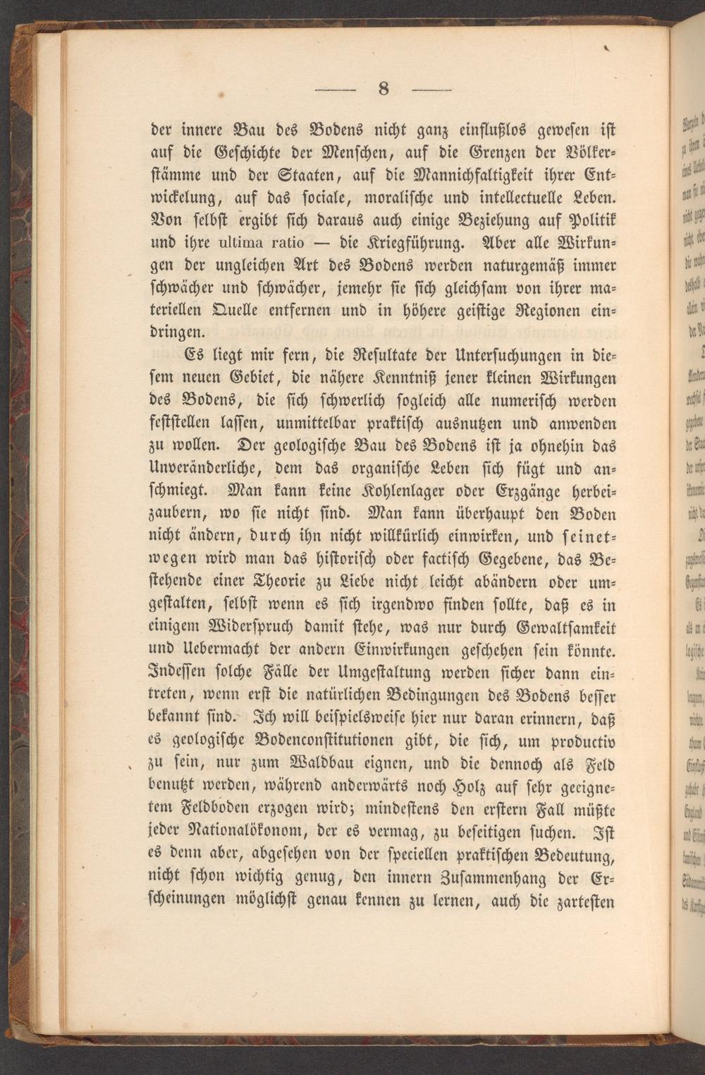 Es liegt mir fern, die Reſultate der Unterſuchungen in die⸗ ſem neuen Gebiet, die nähere Kenntniß jener kleinen Wirkungen des Bodens, die ſich ſchwerlich ſogleich alle numeriſch werden feſtſtellen laſſen, unmittelbar praktiſch ausnutzen und anwenden zu wollen. Der geologiſche Bau des Bodens iſt ja ohnehin das Unveränderliche, dem das organiſche Leben ſich fügt und an— ſchmiegt. Man kann keine Kohlenlager oder Erzgänge herbei⸗ zaubern, wo ſie nicht ſind. Man kann überhaupt den Boden nicht ändern, durch ihn nicht willkürlich einwirken, und ſeinet— wegen wird man das hiſtoriſch oder factiſch Gegebene, das Be⸗ ſtehende einer Theorie zu Liebe nicht leicht abändern oder um⸗ geſtalten, ſelbſt wenn es ſich irgendwo finden ſollte, daß es in einigem Widerſpruch damit ſtehe, was nur durch Gewaltſamkeit und Uebermacht der andern Einwirkungen geſchehen ſein könnte. Indeſſen ſolche Fälle der Umgeſtaltung werden ſicher dann ein⸗ treten, wenn erſt die natürlichen Bedingungen des Bodens beſſer bekannt ſind. Ich will beiſpielsweiſe hier nur daran erinnern, daß es geologiſche Bodenconſtitutionen gibt, die ſich, um productiv zu ſein, nur zum Waldbau eignen, und die dennoch als Feld benutzt werden, während anderwärts noch Holz auf ſehr geeigne⸗ tem Feldboden erzogen wird; mindeſtens den erſtern Fall müßte jeder Nationalökonom, der es vermag, zu beſeitigen ſuchen. Iſt es denn aber, abgeſehen von der ſpeciellen praktiſchen Bedeutung, nicht ſchon wichtig genug, den innern Zuſammenhang der Er⸗ ſcheinungen möglichſt genau kennen zu lernen, auch die zarteſten