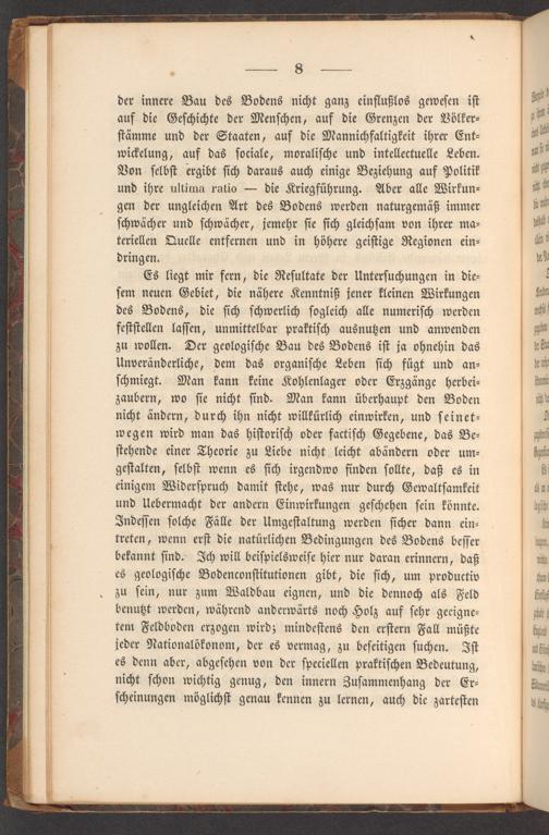 der innere Bau des Bodens nicht ganz einflußlos geweſen iſt auf die Geſchichte der Menſchen, auf die Grenzen der Völker⸗ ſtämme und der Staaten, auf die Mannichfaltigkeit ihrer Ent⸗ wickelung, auf das ſociale, moraliſche und intellectuelle Leben. Von ſelbſt ergibt ſich daraus auch einige Beziehung auf Politik und ihre ultima ratio— die Kriegführung. Aber alle Wirkun⸗ gen der ungleichen Art des Bodens werden naturgemäß immer ſchwächer und ſchwächer, jemehr ſie ſich gleichſam von ihrer ma⸗ teriellen Quelle entfernen und in höhere geiſtige Regionen ein— dringen.