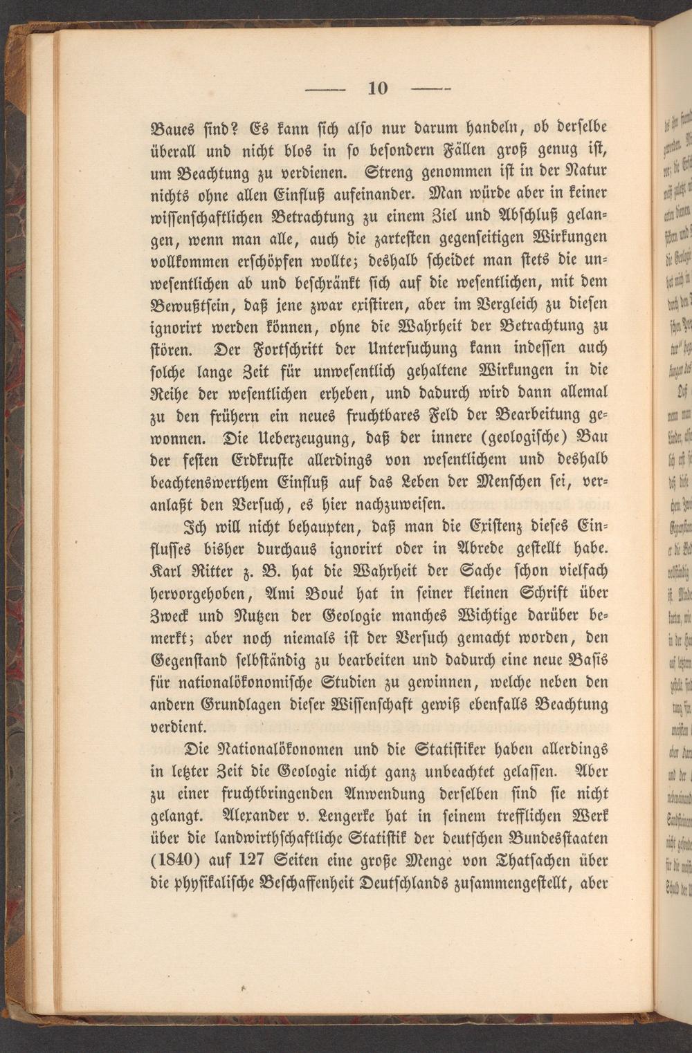 Die Nationalökonomen und die Statiſtiker haben allerdings in letzter Zeit die Geologie nicht ganz unbeachtet gelaſſen. Aber zu einer fruchtbringenden Anwendung derſelben ſind ſie nicht gelangt. Alexander v. Lengerke hat in ſeinem trefflichen Werk über die landwirthſchaftliche Statiſtik der deutſchen Bundesſtaaten (1840) auf 127 Seiten eine große Menge von Thatſachen über die phyſikaliſche Beſchaffenheit Deutſchlands zuſammengeſtellt, aber