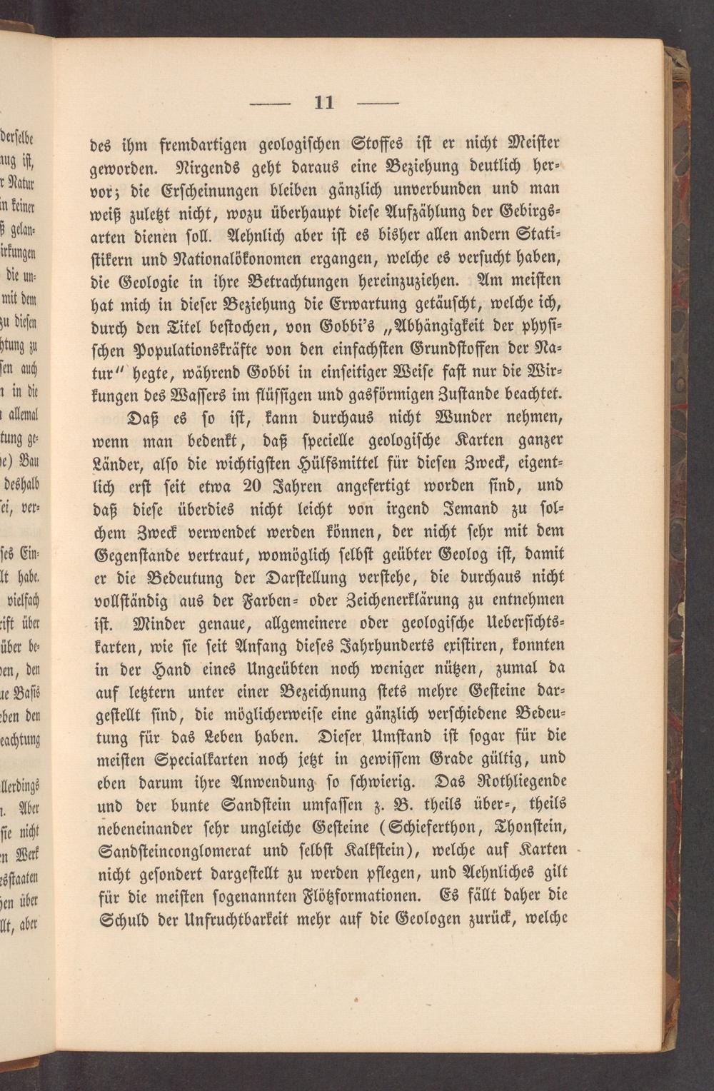 des ihm fremdartigen geologiſchen Stoffes iſt er nicht Meiſter geworden. Nirgends geht daraus eine Beziehung deutlich her⸗ vor; die Erſcheinungen bleiben gänzlich unverbunden und man weiß zuletzt nicht, wozu überhaupt dieſe Aufzählung der Gebirgs⸗ arten dienen ſoll. Aehnlich aber iſt es bisher allen andern Stati⸗ ſtikern und Nationalökonomen ergangen, welche es verſucht haben, die Geologie in ihre Betrachtungen hereinzuziehen. Am meiſten hat mich in dieſer Beziehung die Erwartung getäuſcht, welche ich, durch den Titel beſtochen, von Gobbi's„Abhängigkeit der phyſi⸗ ſchen Populationskräfte von den einfachſten Grundſtoffen der Na⸗ tur“ hegte, während Gobbi in einſeitiger Weiſe faſt nur die Wir⸗ kungen des Waſſers im flüſſigen und gasförmigen Zuſtande beachtet.