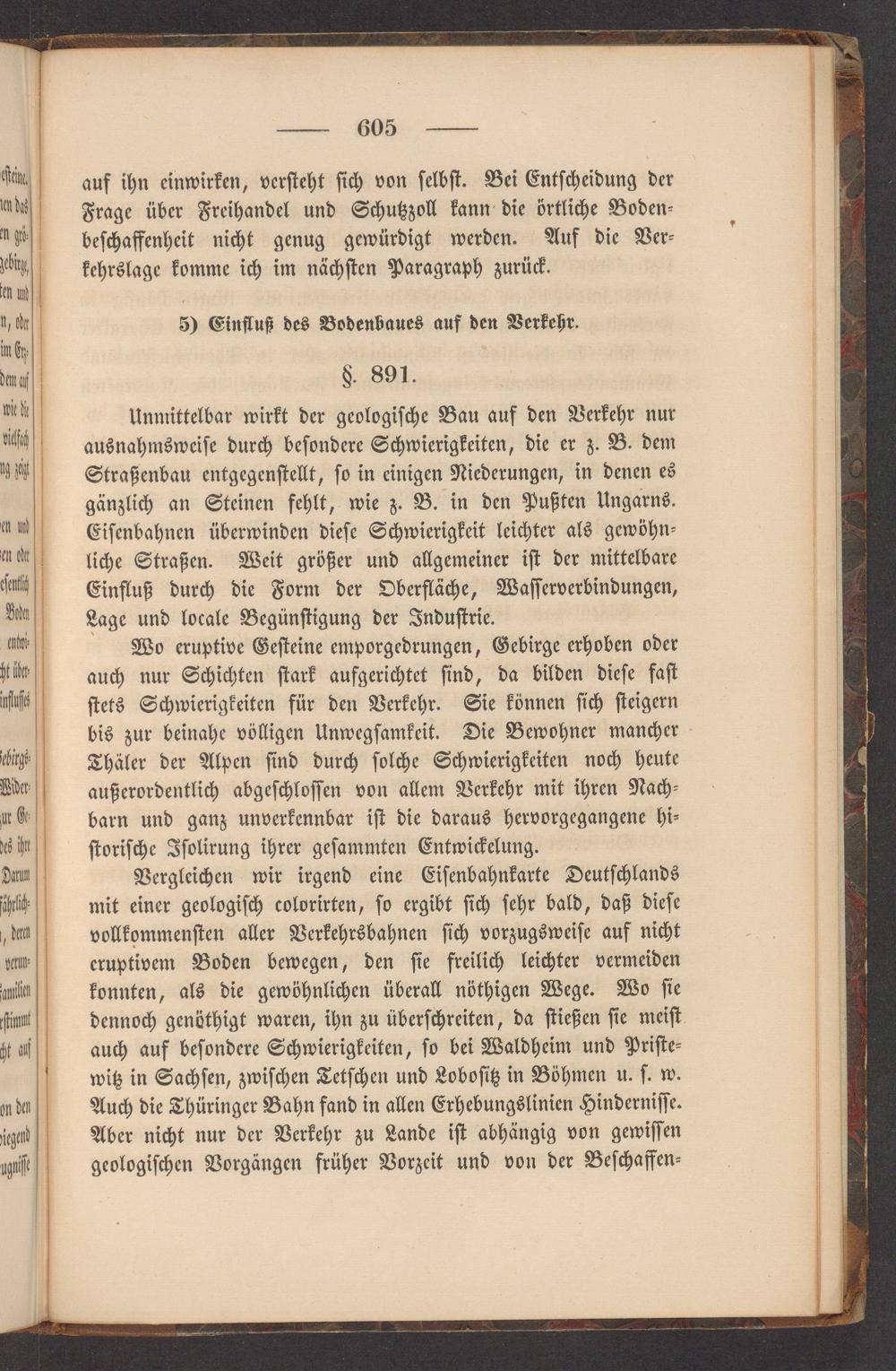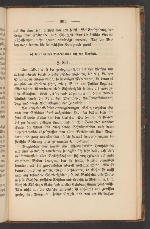 Vergleichen wir irgend eine Eiſenbahnkarte Deutſchlands mit einer geologiſch colorirten, ſo ergibt ſich ſehr bald, daß dieſe vollkommenſten aller Verkehrsbahnen ſich vorzugsweiſe auf nicht eruptivem Boden bewegen, den ſie freilich leichter vermeiden konnten, als die gewöhnlichen überall nöthigen Wege. Wo ſie dennoch genöthigt waren, ihn zu überſchreiten, da ſtießen ſie meiſt auch auf beſondere Schwierigkeiten, ſo bei Waldheim und Priſte⸗ witz in Sachſen, zwiſchen Tetſchen und Loboſitz in Böhmen u. ſ. w. Auch die Thüringer Bahn fand in allen Erhebungslinien Hinderniſſe. Aber nicht nur der Verkehr zu Lande iſt abhängig von gewiſſen geologiſchen Vorgängen früher Vorzeit und von der Beſchaffen⸗