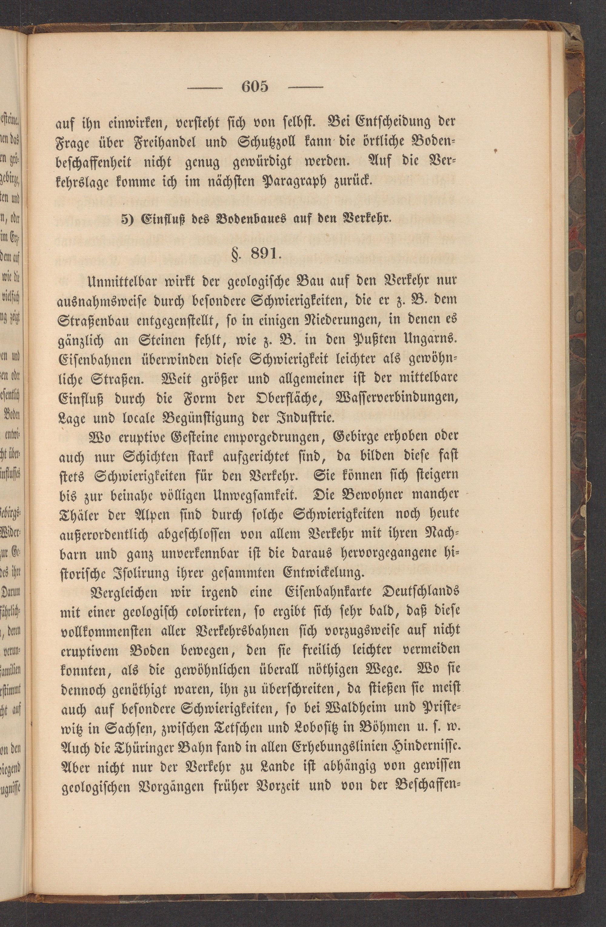 Unmittelbar wirkt der geologiſche Bau auf den Verkehr nur ausnahmsweiſe durch beſondere Schwierigkeiten, die er z. B. dem Straßenbau entgegenſtellt, ſo in einigen Niederungen, in denen es gänzlich an Steinen fehlt, wie z. B. in den Pußten Ungarns. Eiſenbahnen überwinden dieſe Schwierigkeit leichter als gewöhn⸗ liche Straßen. Weit größer und allgemeiner iſt der mittelbare Einfluß durch die Form der Oberfläche, Waſſerverbindungen, Lage und locale Begünſtigung der Induſtrie.