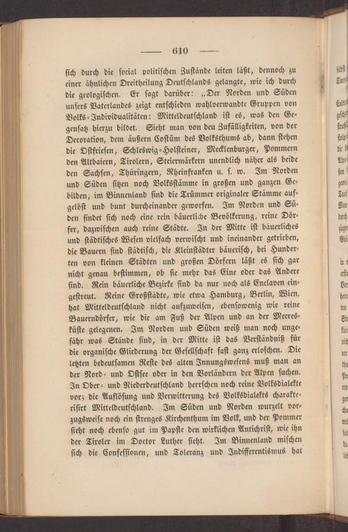 ſich durch die ſocial politiſchen Zuſtände leiten läßt, dennoch zu einer ähnlichen Dreitheilung Deutſchlands gelangte, wie ich durch die geologiſchen. Er ſagt darüber:„Der Norden und Süden unſers Vaterlandes zeigt entſchieden wahlverwandte Gruppen von Volks⸗Individualitäten: Mitteldeutſchland iſt es, was den Ge⸗ genſatz hierzu bildet. Sieht man von deu Zufälligkeiten, von der Decoration, dem äußern Coſtüm des Volksthums ab, dann ſtehen die Oſtfrieſen, Schleswig⸗Holſteiner, Mecklenburger, Pommern den Altbaiern, Tirolern, Steiermärkern unendlich näher als beide den Sachſen, Thüringern, Rheinfranken u. ſ. w. Im Norden und Süden ſitzen noch Volksſtämme in großen und ganzen Ge⸗ bilden, im Binnenland ſind die Trümmer originaler Stämme auf⸗ gelöſt und bunt durcheinander geworfen. Im Norden und Sü— den findet ſich noch eine rein bäuerliche Bevölkerung, reine Dör⸗ fer, dazwiſchen auch reine Städte. In der Mitte iſt bäuerliches und ſtädtiſches Weſen vielfach verwiſcht und ineinander getrieben, die Bauern ſind ſtädtiſch, die Kleinſtädter bäueriſch, bei Hunder⸗ ten von kleinen Städten und großen Dörfern läßt es ſich gar nicht genau beſtimmen, ob ſie mehr das Eine oder das Andere ſind. Rein bäuerliche Bezirke ſind da nur noch als Enclaven ein⸗ geſtreut. Reine Großſtädte, wie etwa Hamburg, Berlin, Wien, hat Mitteldeutſchland nicht aufzuweiſen, ebenſowenig wie reine Bauerndörfer, wie die am Fuß der Alpen und an der Meeres⸗ küſte gelegenen. Im Norden und Süden weiß man noch unge⸗ fähr was Stände ſind, in der Mitte iſt das Verſtändniß für die organiſche Gliederung der Geſellſchaft faſt ganz erloſchen. Die letzten bedeutſamen Reſte des alten Innungsweſens muß man an der Nord⸗ und Oſtſee oder in den Vorländern der Alpen ſuchen. In Ober⸗ und Niederdeutſchland herrſchen noch reine Volksdialekte vor; die Auflöſung und Verwitterung des Volksdialekts charakte⸗ riſirt Mitteldeutſchland. Im Süden und Norden wurzelt vor⸗ zugsweiſe noch ein ſtrenges Kirchenthum im Volk, und der Pommer ſieht noch ebenſo gut im Papſte den wirklichen Antichriſt, wie ihn